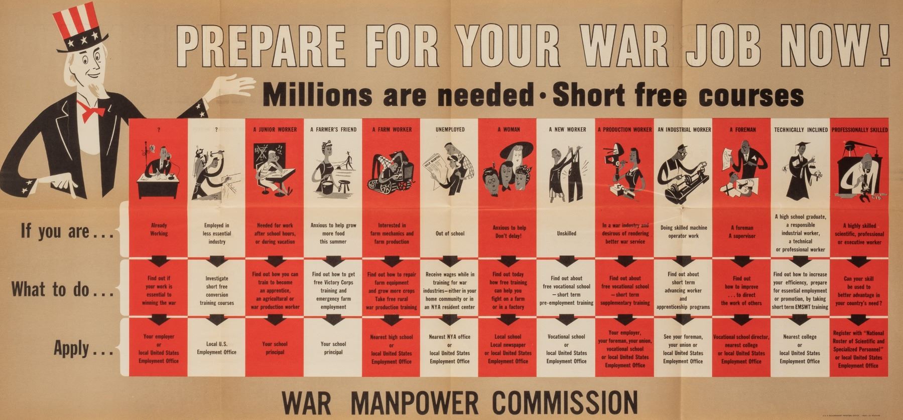 Prepare for your war job now! Millions are needed - Short free courses', U.S. Government Printing Office, 1943-O-533448, 44 x 20.5 inches. Mailing folds and minor tears at edges.