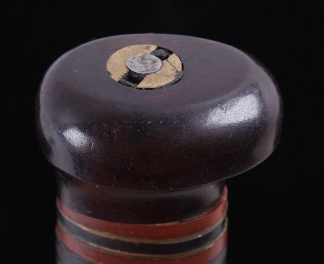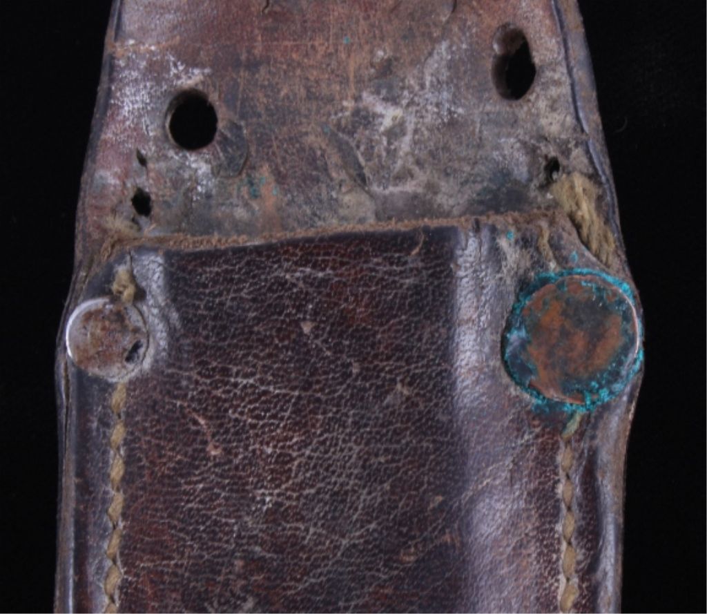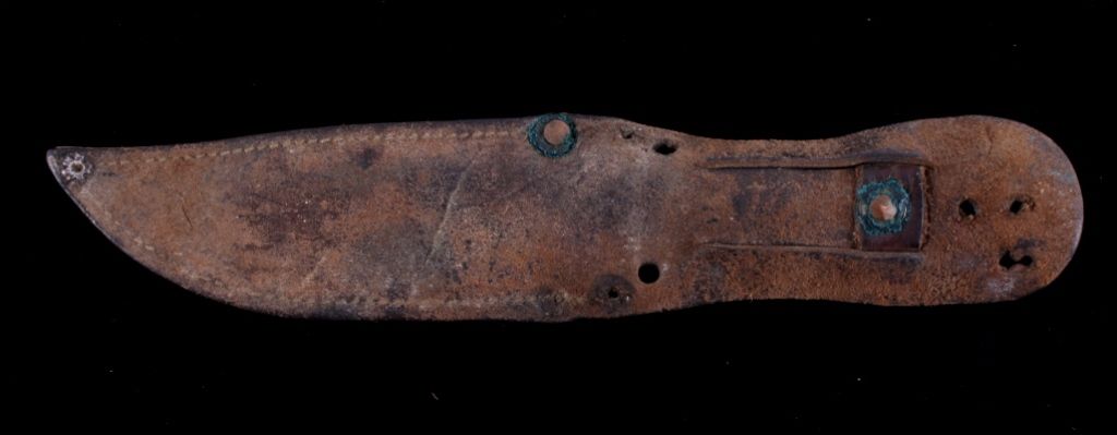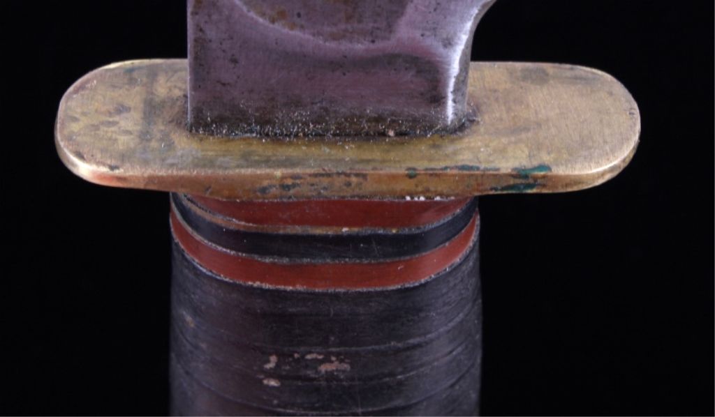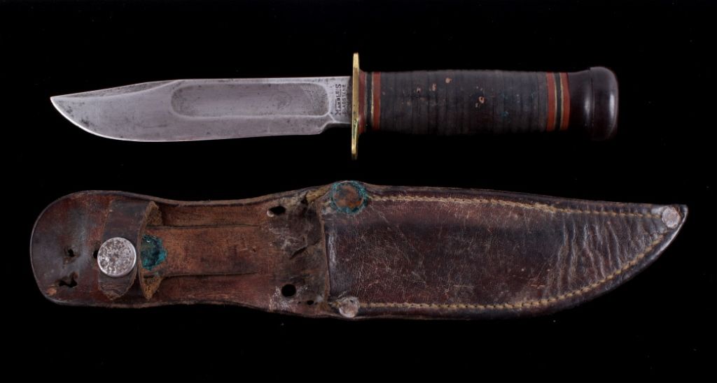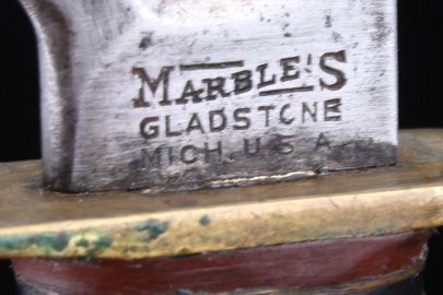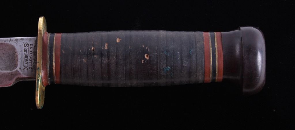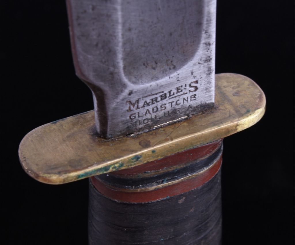 This is a World War II combat used Marbles Gladstone Mich. USA. fighting knife. This comes with the original leather scabbard and has a bakelite pommel. Very rare used fighting knife. Knife is 9 1/8" with a 5" blade. Scabbard is 10.5"