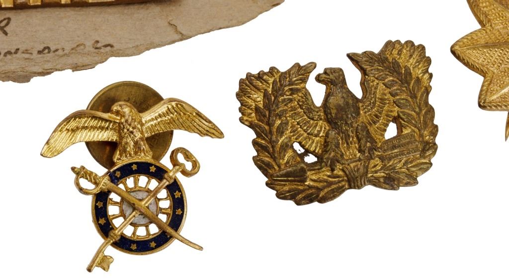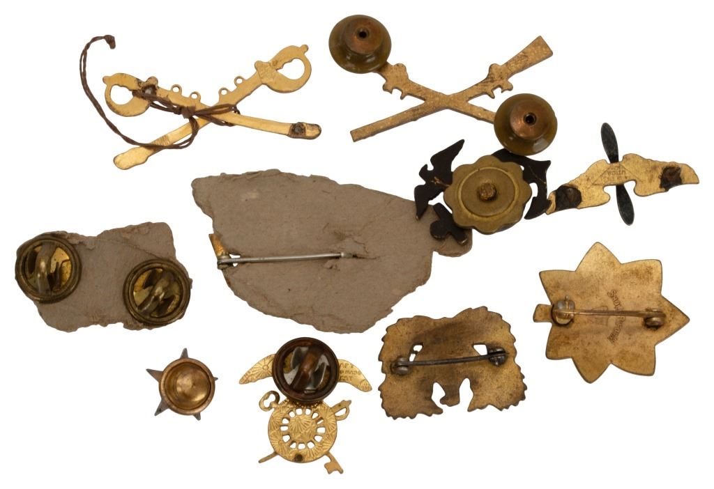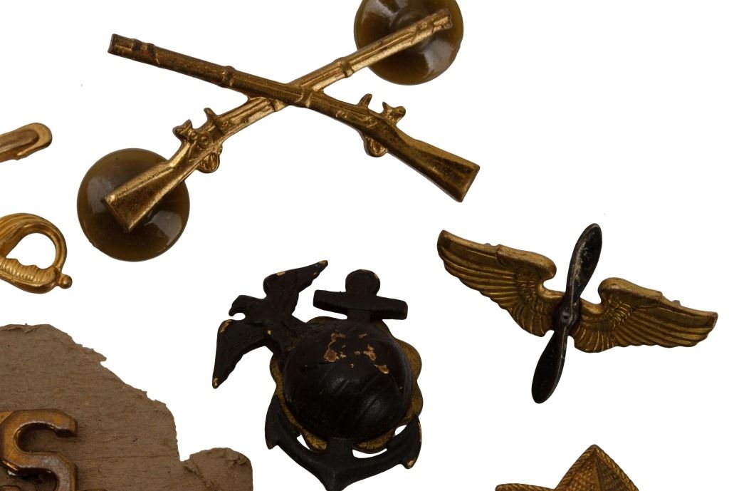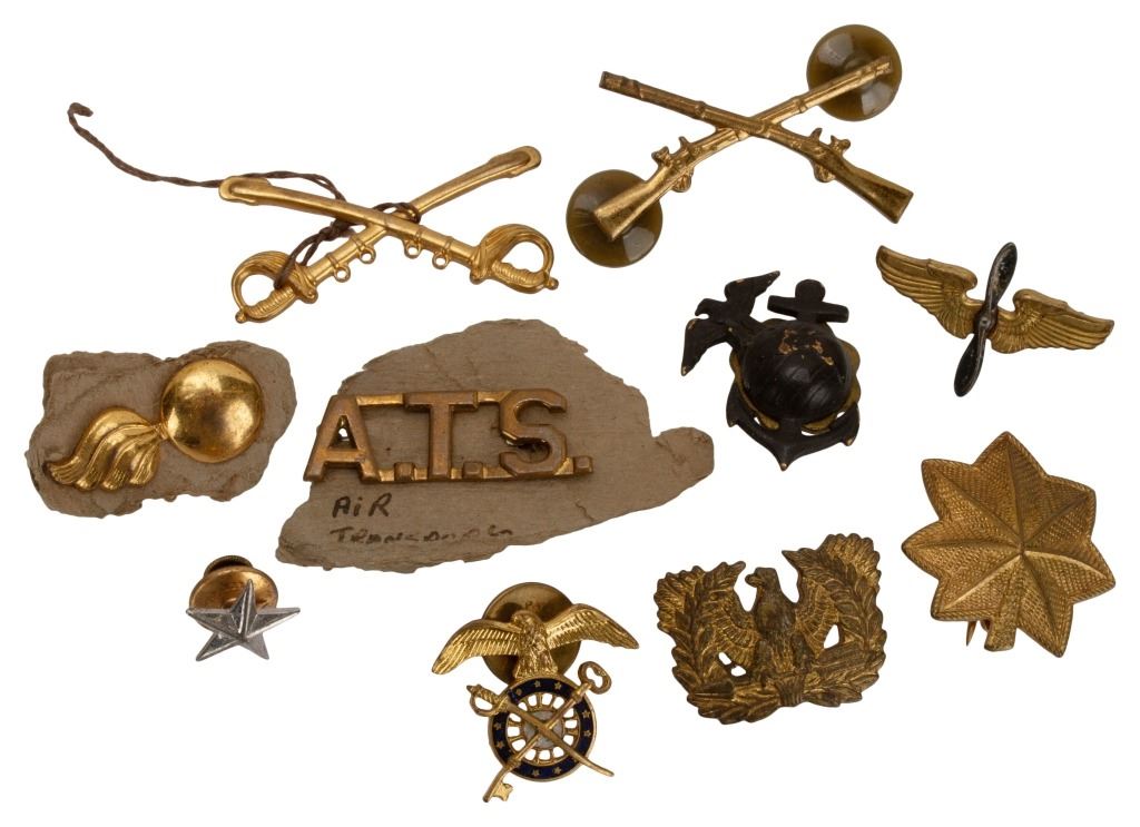 Item/Description: 10 pieces of assorted United States World War 2 military insignia. Includes: WWII A.T.S. Army Transport Service Officer Insignia (Amcraft), US Army Major Gold Oak Leaf Collar Lapel Hat Pin Emblem Badge (Shold-R-Form), US Army Warrant Officer Metal (eagle with open wreath), WWII Army Ordnance Corps Officer Collar Insignia (flaming bomb), U.S. Army Quartermaster Officer Branch (Eagle over crossed swords & blue enamel), WWII U.S. Army Infantry Lapel Pin (crossed rifles), WWII Cavalry Officers Collar Insignia (crossed swords), Star rank pin, WWII Military Utica Wings Propeller Airman Pin and Marine Corps (USMC) Hat Badge (Eagle, globe & anchor).