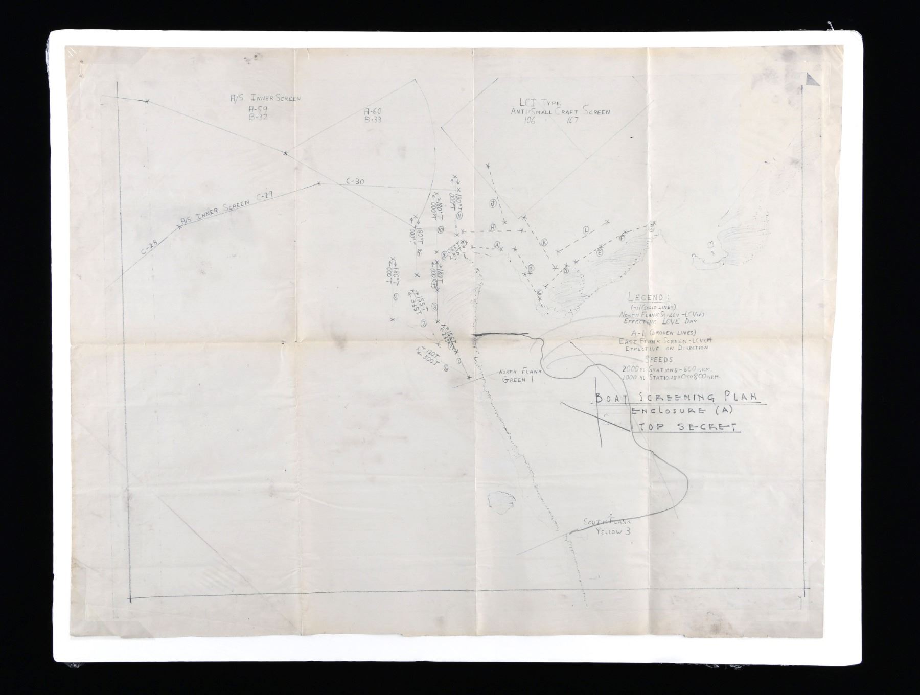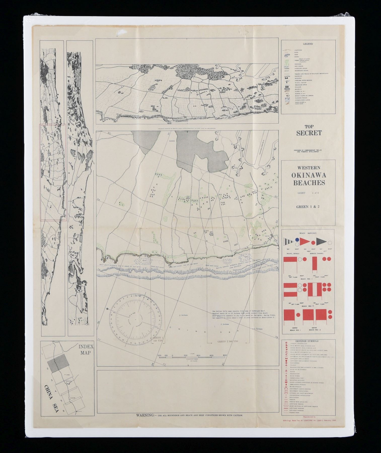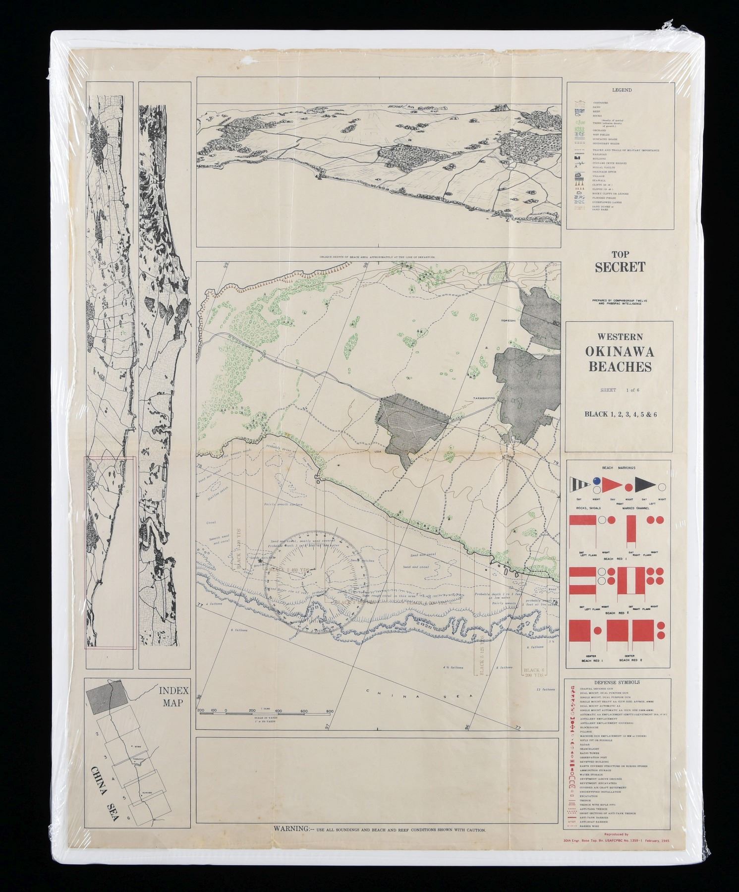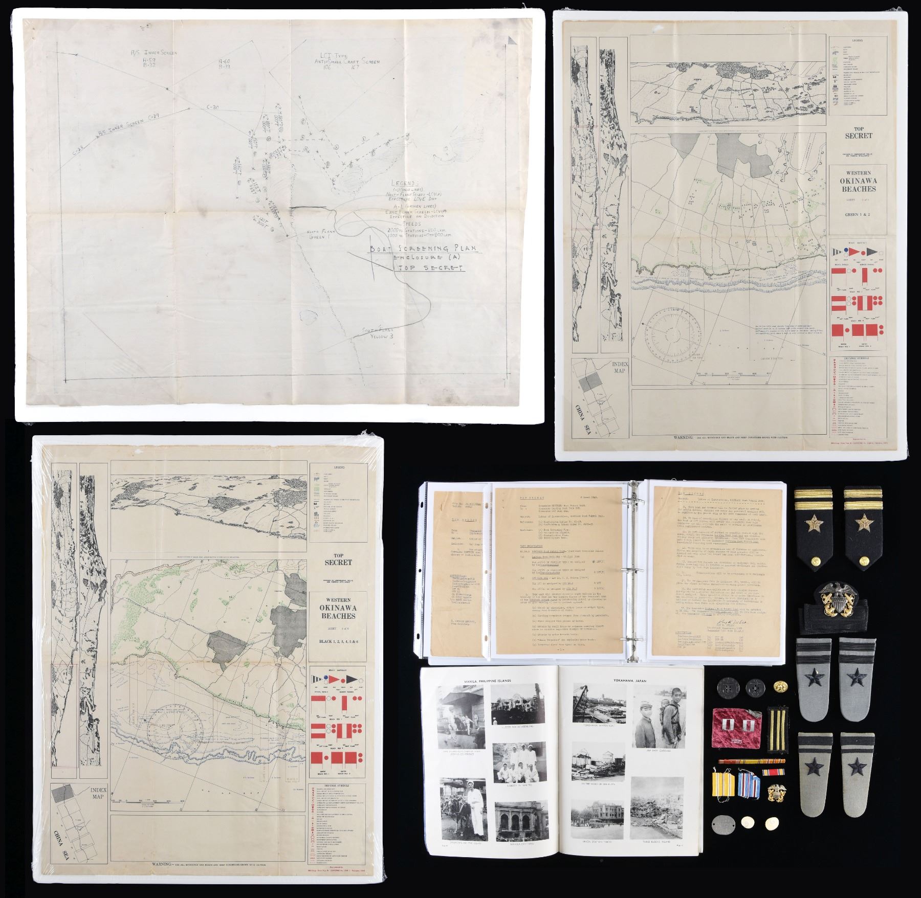 MAPS, AND MORE. This single person WWII group belonged to LTJG John Grant Robinson who was attached to the USS Monrovia. This group includes 2 top secret invasion maps of the Okinawa beaches. / 1 top secret boat screening plan for the landing at Okinawa. / 1 loose-leaf binder containing documents and ephemera relating to LTJG Robinson, as well as landings at Sicily, Tarawa, Kwajalein, Marianas, Leyte, Lingayen, and Okinawa. Many of the documents are marked "TOP SECRET". / 1 "year book" for the USS Monrovia. / 2 pair of LTJG gray shoulder boards. / 1 pair of Lt. dress shoulder boards. / 1 Naval officer's hat eagle and band. / 1 Naval officer's overseas cap eagle. / 1 dog tag for John Grant Robinson of the U.S.N.R. / 1 pair of sterling pin-on Lt.'s bars. / 8 small military ribbons, buttons, etc. / 2 shells likely from Okinawa. CONDITION: maps have been shrink-wrapped but show folds. Militaria shows light wear. Year book shows wear to the corners. Many documents have yellowed with age but remain exceptionally legible. (02-24291/BF). $600-900.