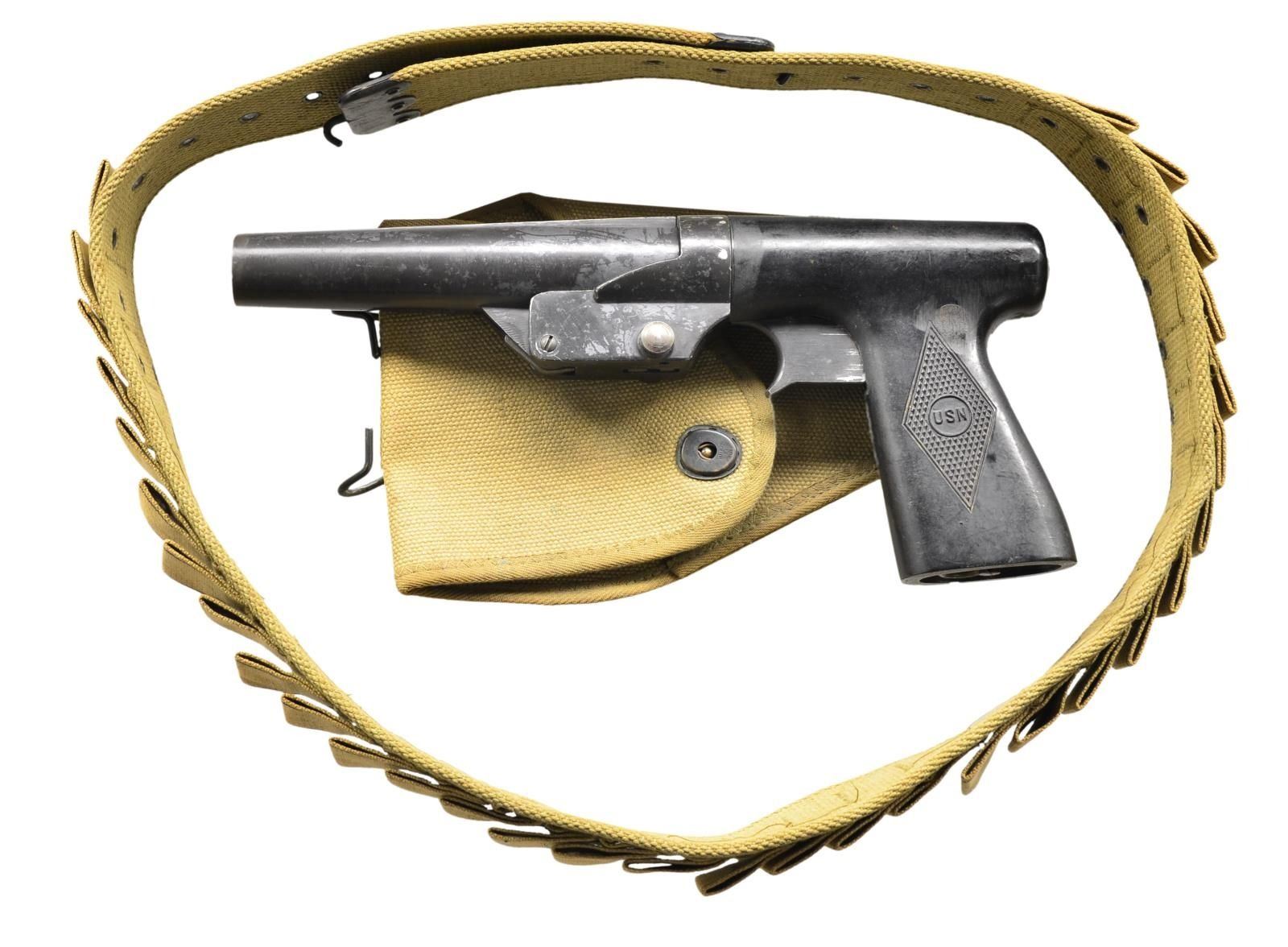 Cal. 10 Ga. NSN. Bbl. 6" smoothbore. Top of bbl. has 1944 date & Sedgley markings. Checkered black grip assembly marked "USN" both sides. UNATTACHED ACCESSORIES: USGI MK5 signal holster & belt. CONDITION: metal shows some oxidation, scattered scuffing, flaking paint & handling wear. Bore shows scattered light oxidation. PROVENANCE: The Collection of Edward Scott Meadows. (02-22702/MJC). $200-300.