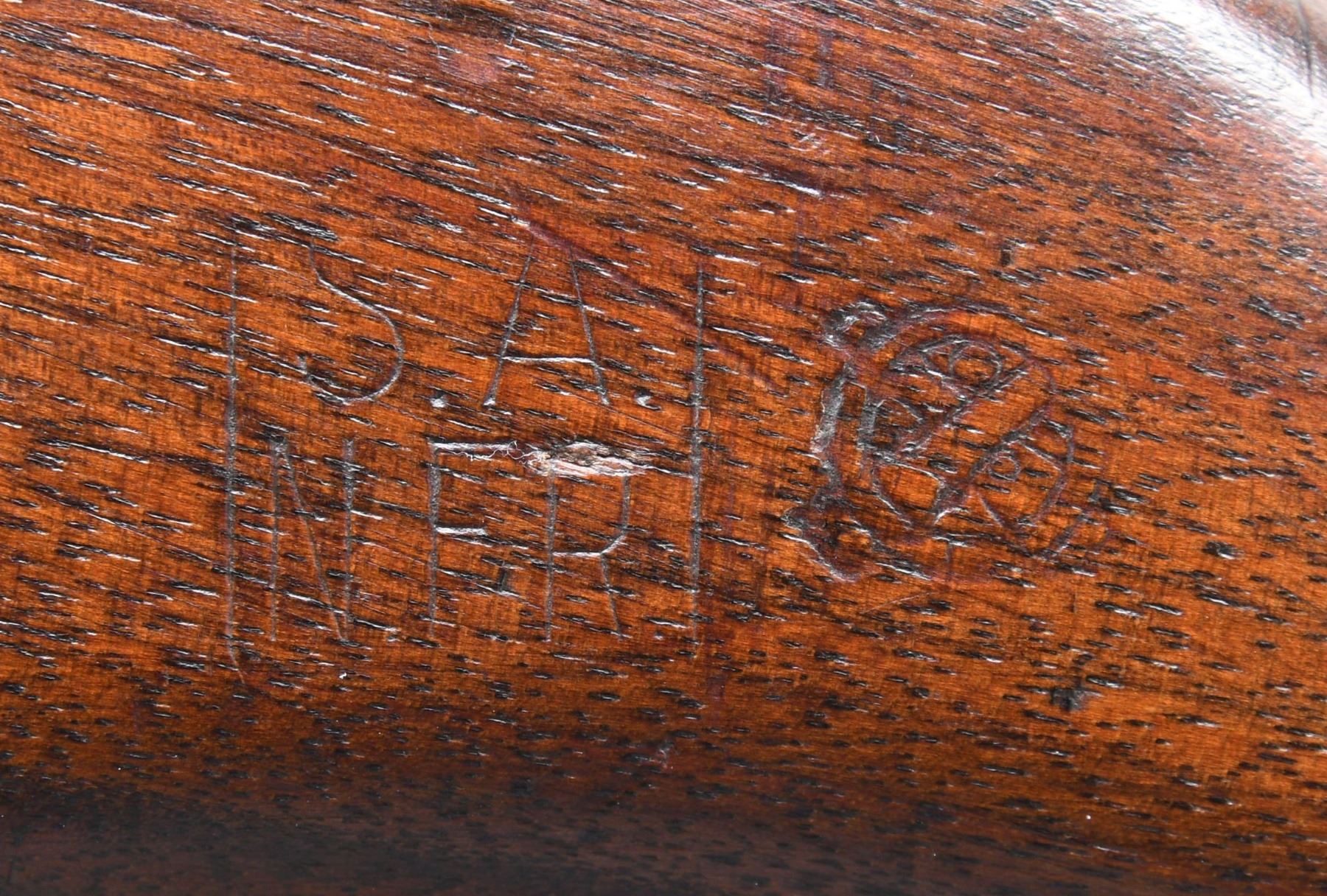 RIFLE. Cal. 30-06. S# 3385141. Bbl. 24". Bbl. is marked on right side "1-S-A-12-44". Throat and muzzle gauge 2.0. Locking bar aperture rear sight w/ battle range elevation knob. Blade front sight w/ protective ears. All visible parts markings are SA including the operating rod which does not have the clearance cut. Stamped trigger guard w/ correct early type notch. Cross slot gas cyl. lock screw marked "PO". Walnut stock set. Buttstock is marked on left side over trigger guard w/ boxed "S.A. / N.F.R. / crossed cannons". Marked under grip w/ encircled "P" proof & marked at end of pistol grip w/ tiny "crossed cannons". Original WW2 vintage green web sling. UNATTACHED ACCESSORIES: nickel plated oiler in butt. CONDITION: original finish stock has legible markings with moderate wear and handling marks. Metal retains 80% of its original lightly worn finish. Very good shiny bore with sharp lands. (25-555/RW). CURIO. $3000-4000.