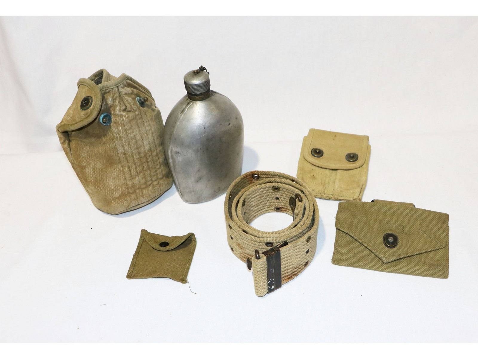 Includes: 1918 dated canteen w/ 1942 dated cover, WWI 45 mag. pouch, bandage pouch, web belt, component pouch. All in fair condition. See photos.