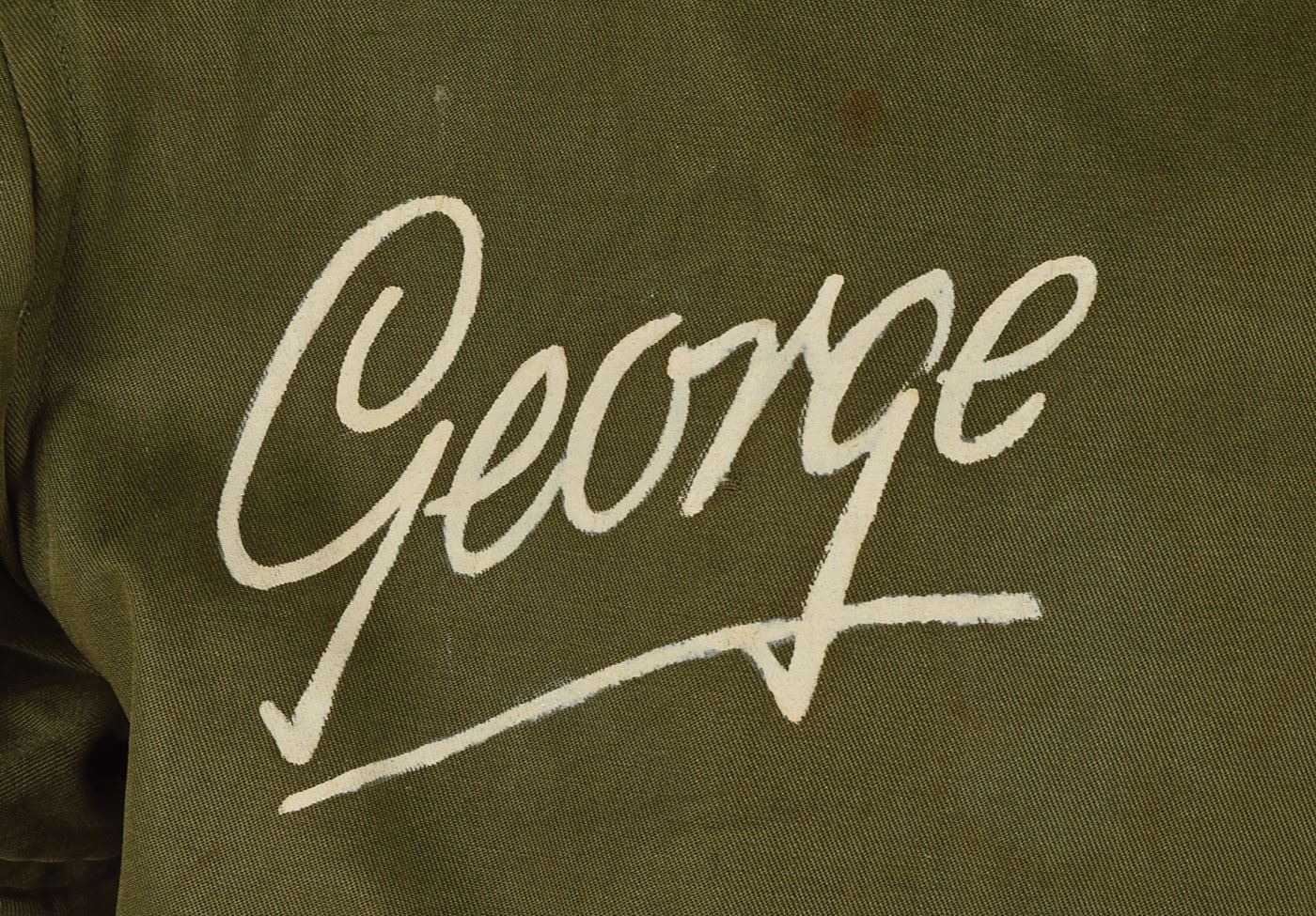An attractive olive drab cloth, issue jacket with brown fur-lined collar, and olive drab elastic hem and cuffs. The jacket has a single, functional front zipper, and both large pocket buttons are still present. The jacket was made by Metro Sportswear Inc. of New York, and has the one-piece label on the interior. The exterior cloth is in excellent condition with only mild soiling on a few areas, and some further fraying of the cuff and hem fabric is also visible. The jacket is embellished on the front with the previous owner's name, skillfully painted in white script: “George.” The back of the jacket has a large black riband at the top with the aircraft name, “Bachelors Buggy,” in yellow on black. Below that is a 3/4 view of a late model, nose turret-equipped B-24 Liberator with “Bachelor's Buggy” in red on the nose, and the red tail markings of the 466th Bombardment Group (the plane letter identifier “V” is clear on the central horizontal stripe), with a falling bomb with “Thirty Four” underneath. The painting is in excellent condition with some crackling along the riband, and some slight flaking of the metallic paint on the aircraft. The interior of the jacket has an excellent, brown alpaca lining, as well as a small ink spot above the inside pocket snap. The 466th Bombardment Group was comprised of four squadrons, the 784th, 785th, 786th, and 787th, flying missions out of Attlebridge, Norfolk. This is an absolutely splendid painted jacket, and would make a fantastic addition to any collection.