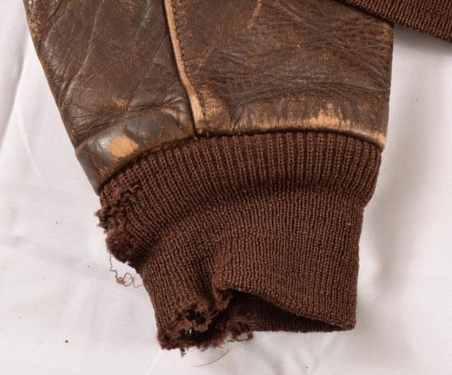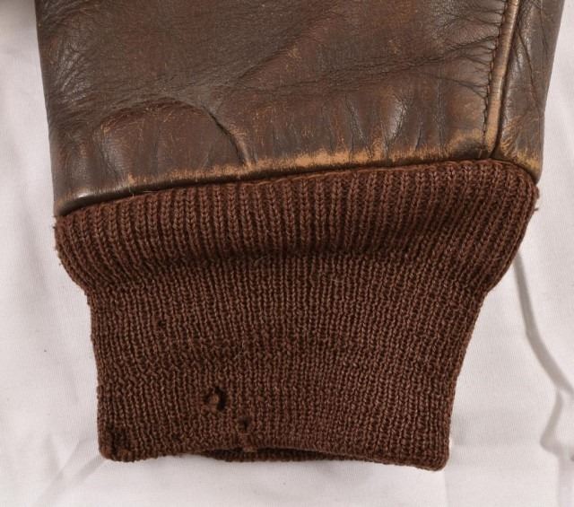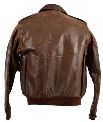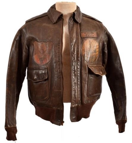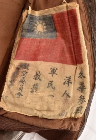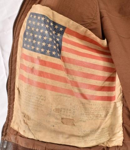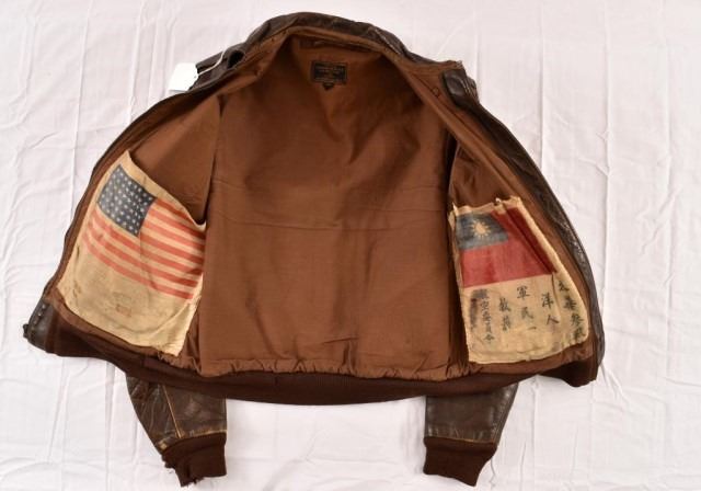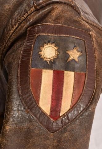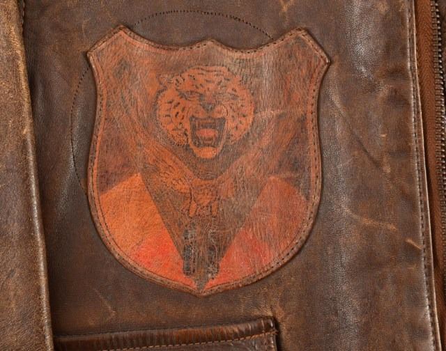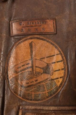 491st Bomb Squadron, 341st Bomb Group, CBI, Staff Sgt. Walter U. Stachler. 1943. Leather name tag on left pocket with "W. STACHLER" and Chinese chops stamped on the tag, the name is above 491st Bomb Squadron Patch. Tag reads: "TYPE A-2, DRAWING NO. 30-1415, A.C. ORDER NO. 1756, PROPERTY AIR FORCE U.S. ARMY". Size: 36. On lining is stenciled a black square and inside the square is stenciled "A P 3". Printed in black ink on the lining is "S-0617". Right breast has the 341st Bomb Group patch painted on leather of a tiger head and eagle within a "V". On left breast is Stachler's name tag with Chinese chops and a painted, circular patch of a horseshoe around a stake with horizontal speed marks for the "491st Ringer Bomb Squadron". Right shoulder has locally-made leather on leather full color CBE patch. No rank present. Inside lining on the left is a U.S. Flag 5-language Blood Chit. On the right side is a Chinese Flag Blood Chit with Chinese chops. No ship's name present but was undoubtedly a B-25H. Staff Sgt. Walter U. Stachler was an armorer-gunner on the top turret of a B-25 H of the 491st Bomb Squadron.