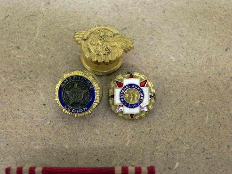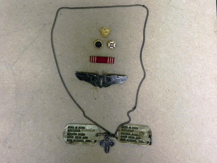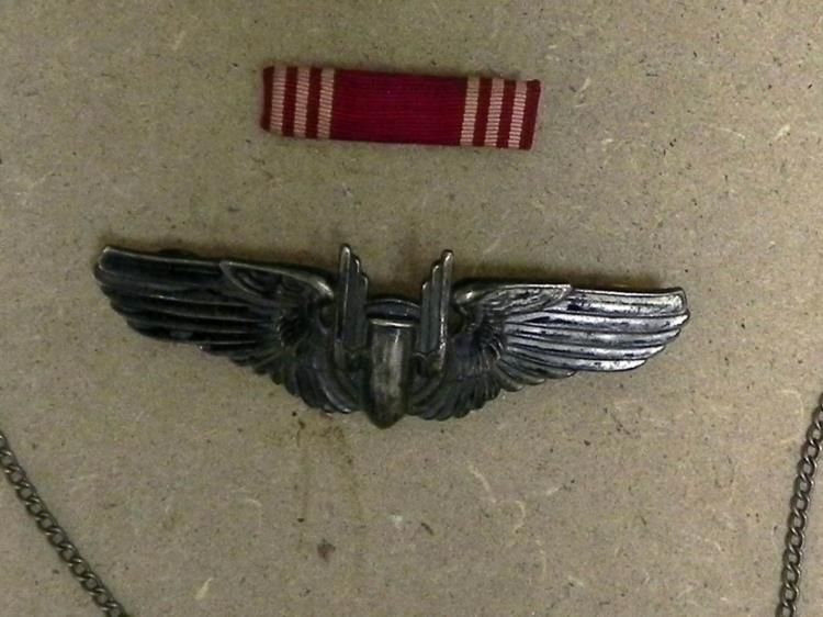 HERE IS A WWII USAAF BOMBADIER GROUPING-3" STERLING BOMBADIER WINGS-DOGTAGS W/CATHOLIC MEDAL+; ALSO RUPTURED DUCK, RIBBON BAR & PINS.