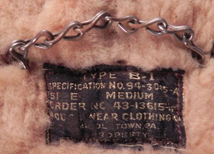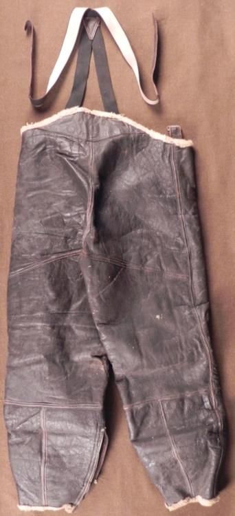 WWII USAAF TYPE B1 LEATHER FLIGHT PANTS-SHEEPSKIN LINED-AAF LOGO W/SUSPENDERS * SEWN IN SUSPENDERS-LEATHER COLD WEATHER FLIGHT PANTS-ZIPPERS ON LEGS & FLY-AAF LOGO ON TOP OF PANTS AND BY FLY ZIPPER--SPEC TAG READS "TYPE B1-SIZE MED-ROUGH WEAR CLOTHING, PA.--PROPERTY OF AIR FORCE-U S ARMY-FULL SHEEPSKIN LINING--TOP HAS CHAIN HANGER *
