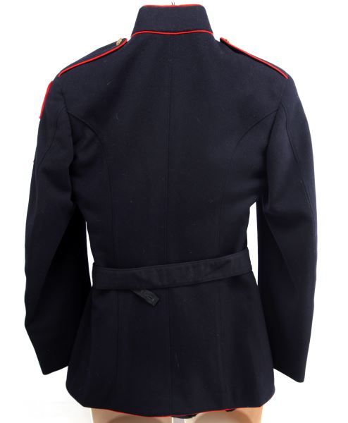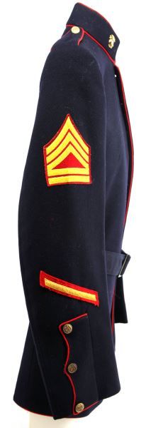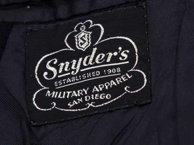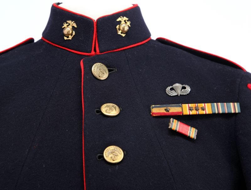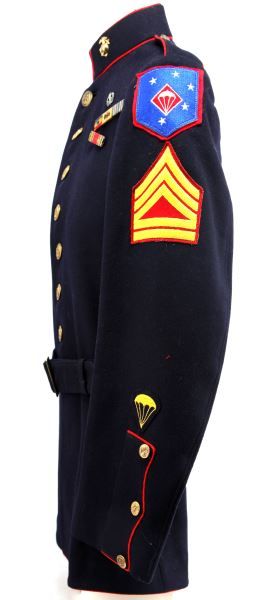 This USMC Technical Sergeant blues is made by Snyder's Military Apparel in San Diego. Left sleeve of the jacket has the 1st Marine Parachute Battalion patch on red felt, looks to be theater made. Buttons on the jacket are marked Superior Quality. Jacket has a Presidential Unit Citation (with service star), Asiatic Pacific Campaign (three service stars), and an American Campaign. Jacket is in very good condition with some slight wear around the collar and includes blue belt.