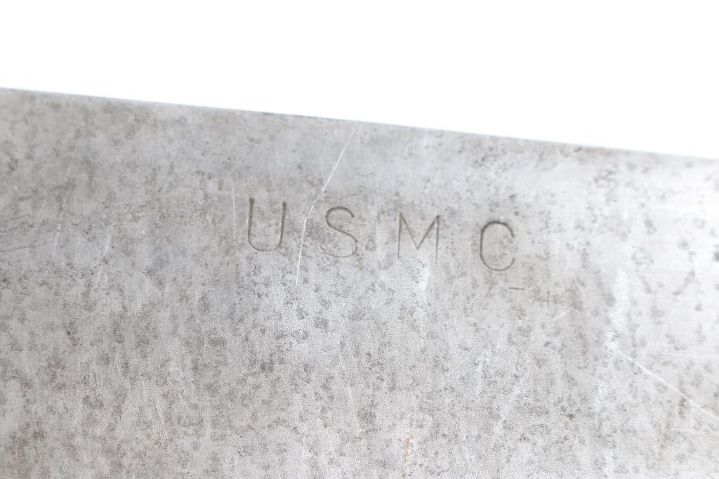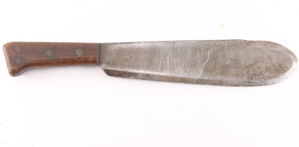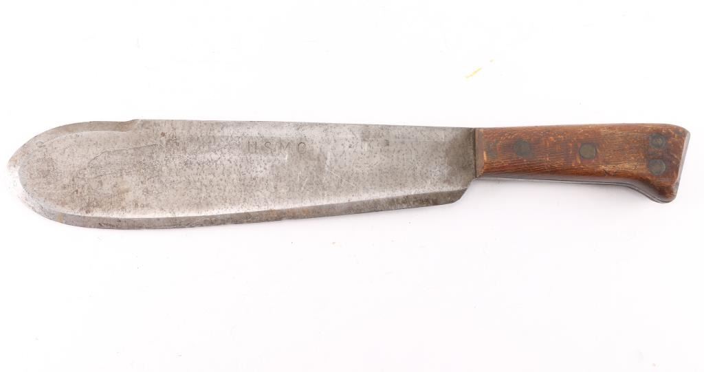 Large bolo Fighting knife/machete, 16 5/8" overall, with 11 1/4" blade, blade is 1/4" thick, marked "USMC" on left side of blade, wood grips w/brass rivets, no scabbard. Blade has pin prick pitting throughout, wood grip panels slightly worn due to aging, with some small scrapes on bottom of wood. Overall good condition.