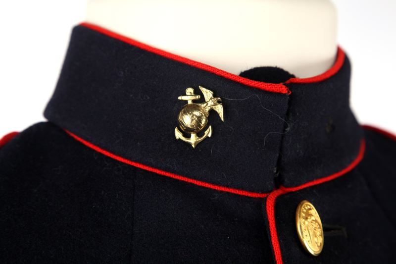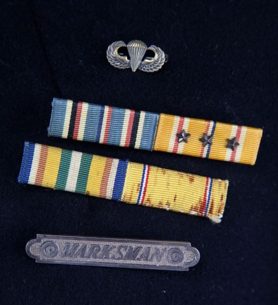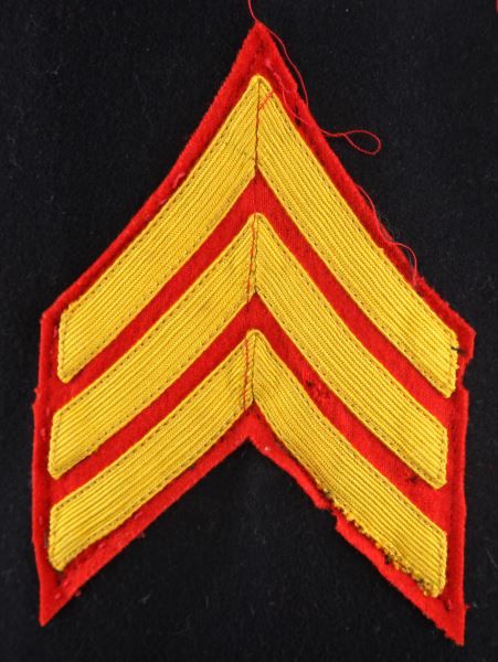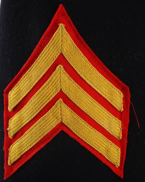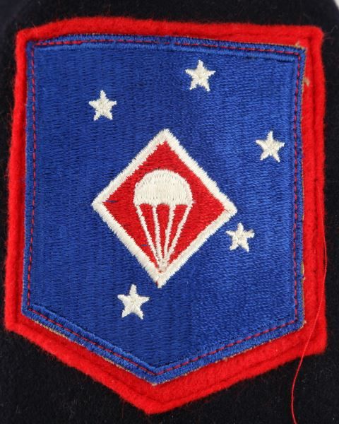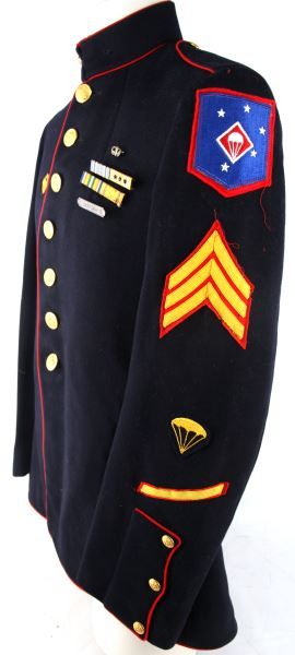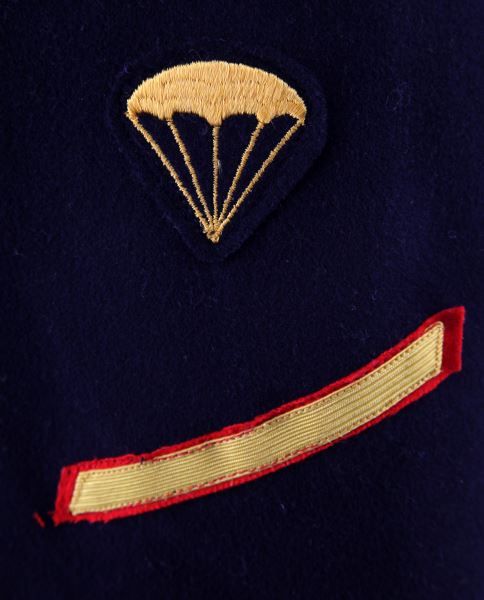 Paramarine (1st Marines Parachute Regiment) Sergeant tunic. With Parachutist Badge, gold parachute regiment striker patch, 1st Marines Parachute Regiment patch with red 1st Assault Wave border. very light mothing; in very good condition.