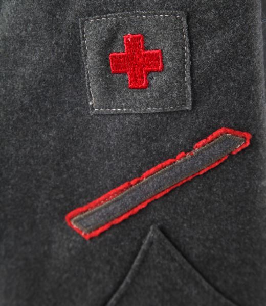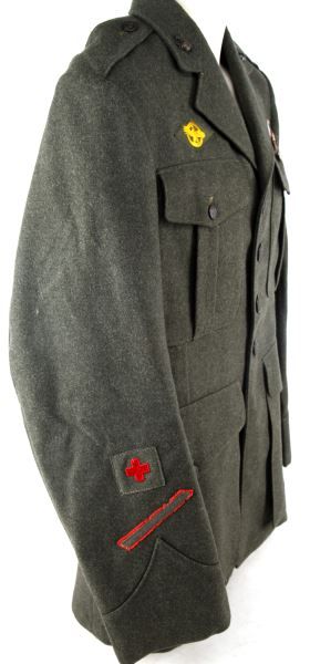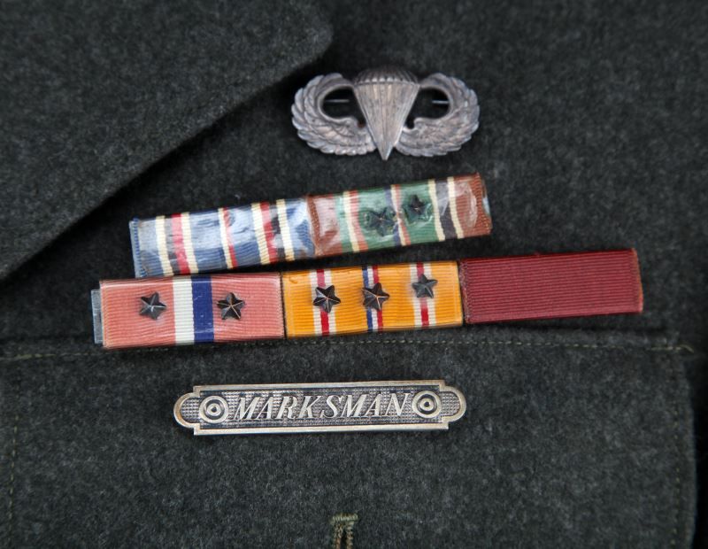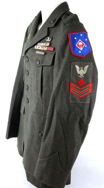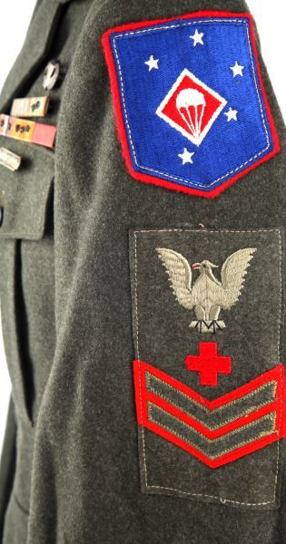 Paramarine patch with red Assault Border, Pharmacist Mate second class patch, Medic striker badge, ruptured Duck, EGA collar device, Campaign Ribbons with service stars, about a size U.S. 40
