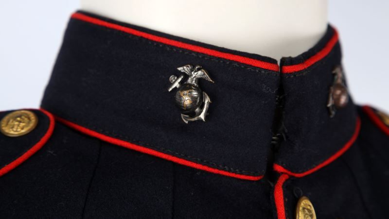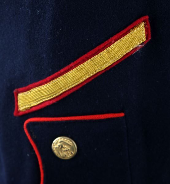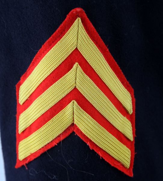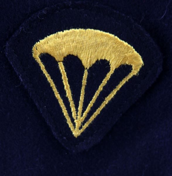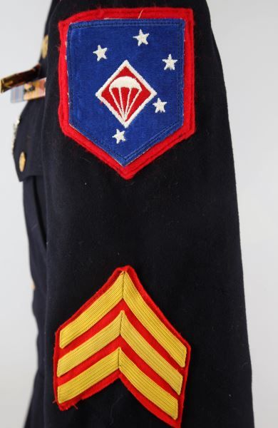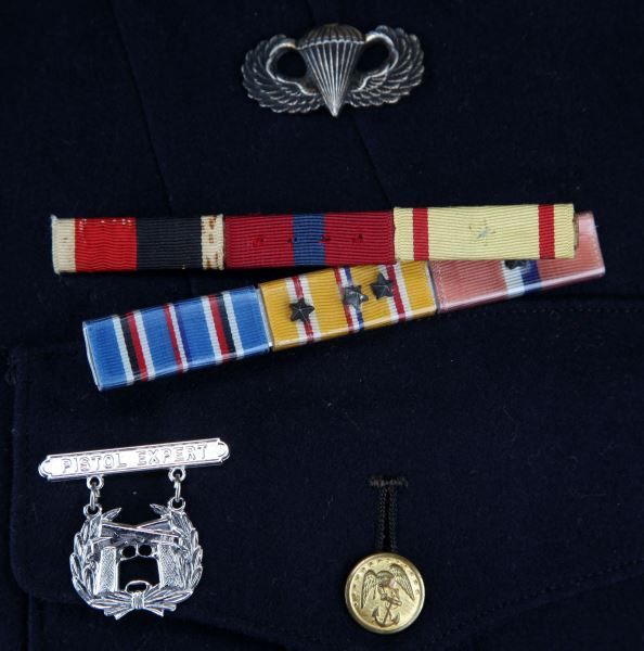 Red felt assault border to shoulder patch Sgt. chevrons, sterling jump wings, pistol expert badge, ribbon rack, small collar EGA, para striker badge, named to E.J. Hahn on white belt, with trousers, these have a small cigarette burn on one leg, otherwise all is very good, small size about a 38 regular.