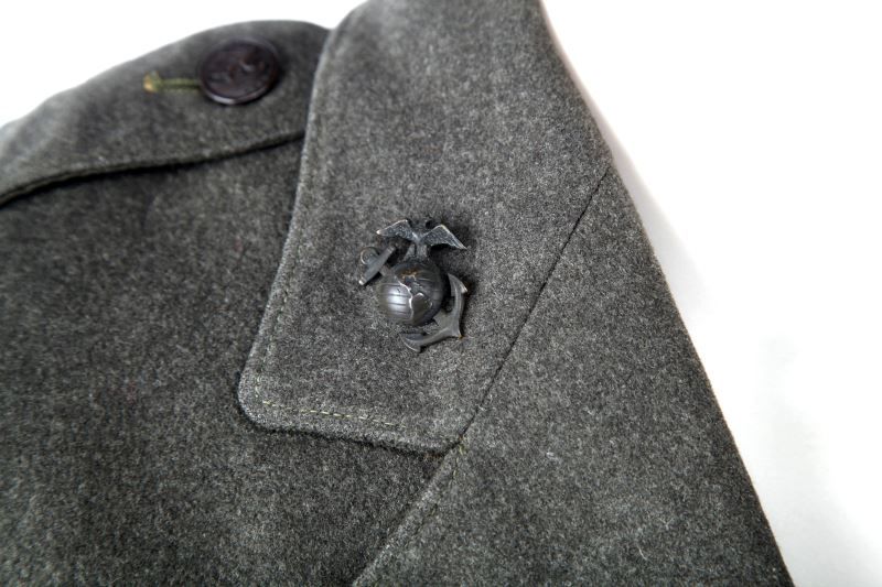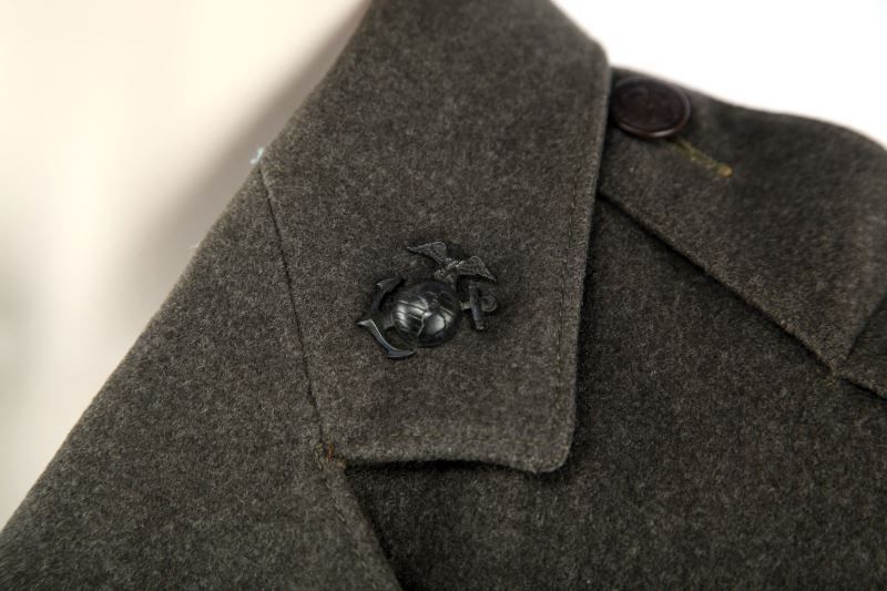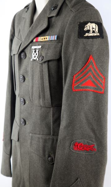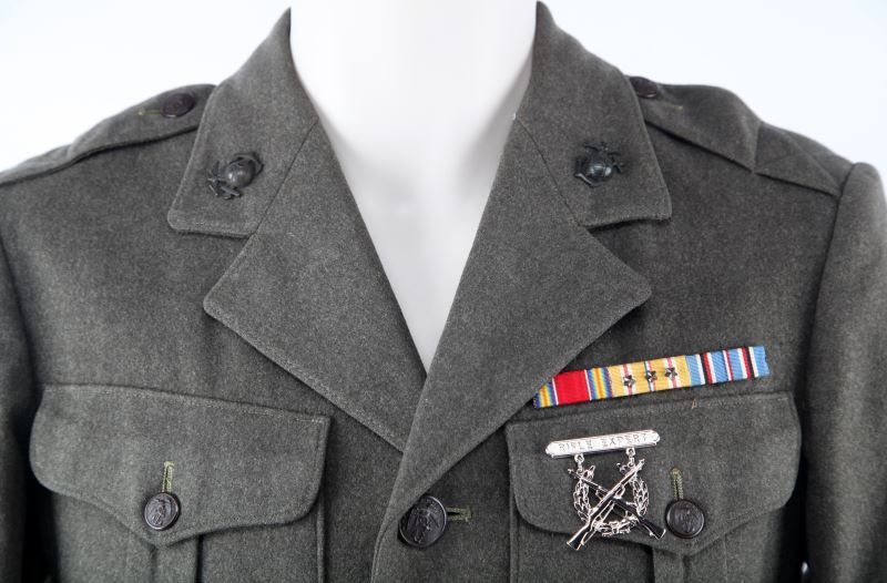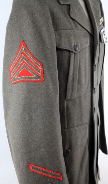 Uniform has the Polar Bear patch along with Staff Sergeant ranking on the left sleeve, Rifle Expert badge, WWII Victory medal Asiatic - Pacific Campaign medal with three star devices, and American Campaign medal. Tunic was made by College Hall Fashion. Includes a pair of trousers with belt slight mothing to the trousers overall Uniform is in good to very good condition.