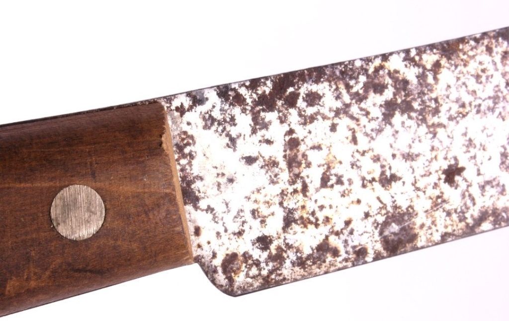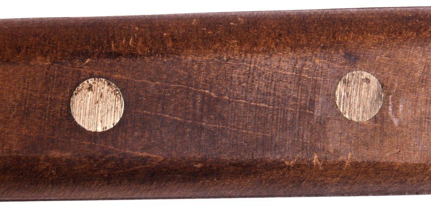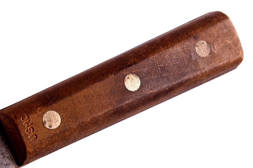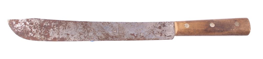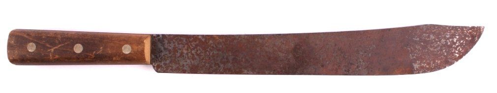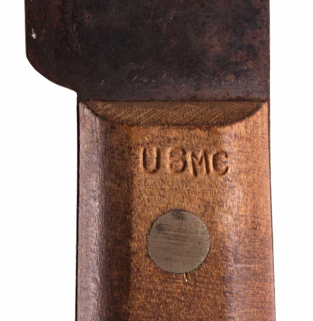 This is a large USMC Marine Corps knife from  World War II. The knife has a wooden handle  which is marked "USMC". The USMC knife is in  good condition, it does show a fair amount of  surface rust on the blade. The piece could have been used in field dressing and also as  a machete. The knife measures 20" with a 14"  blade.