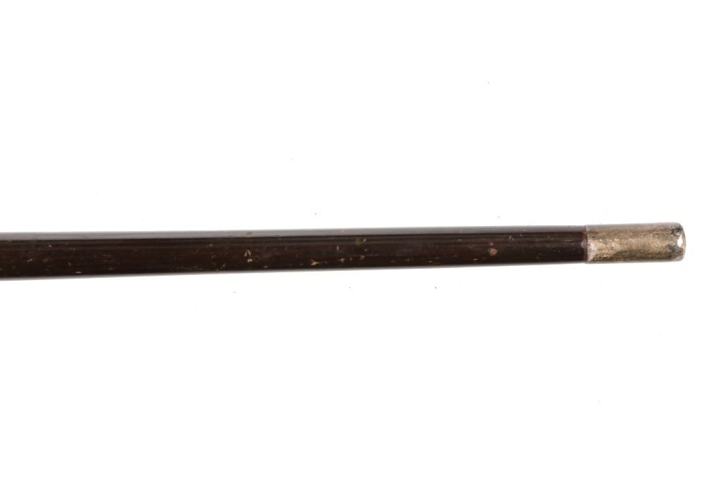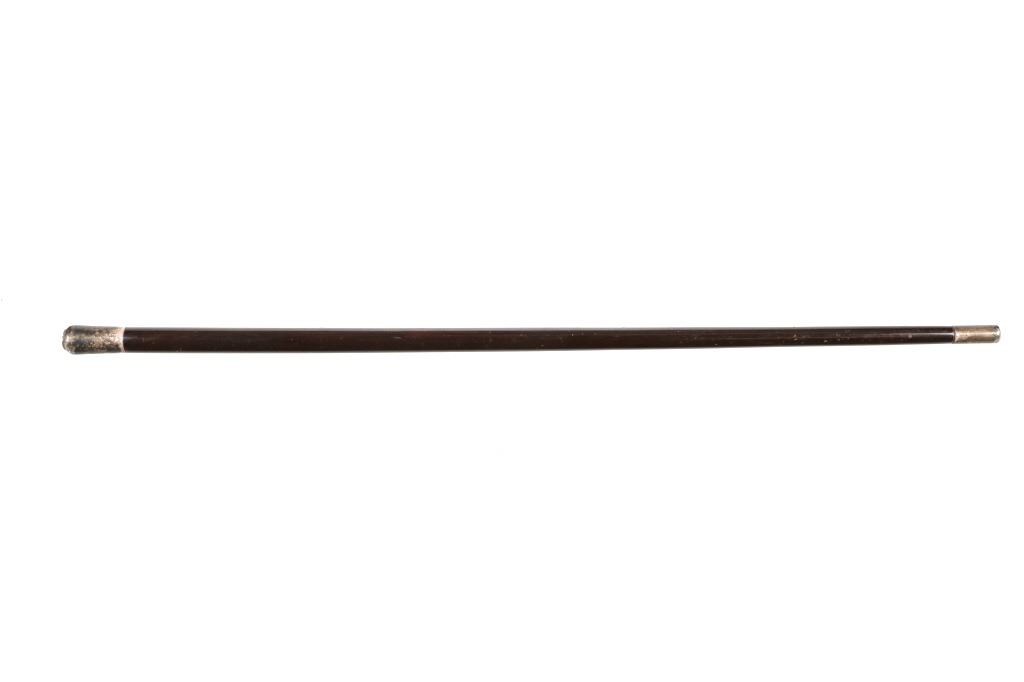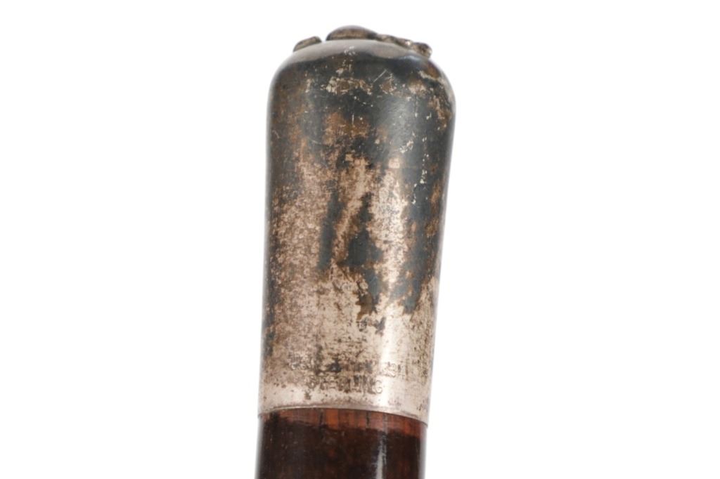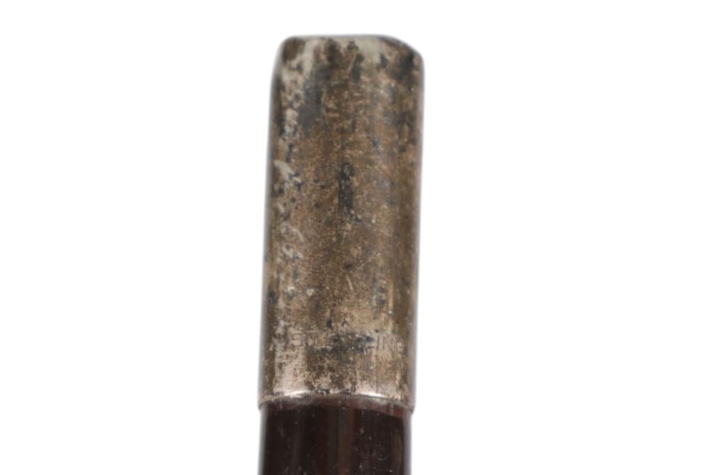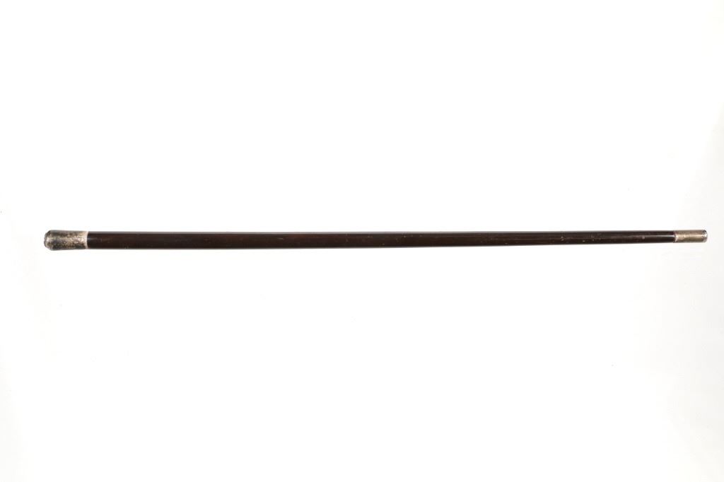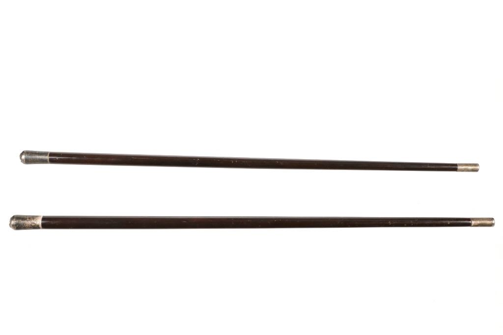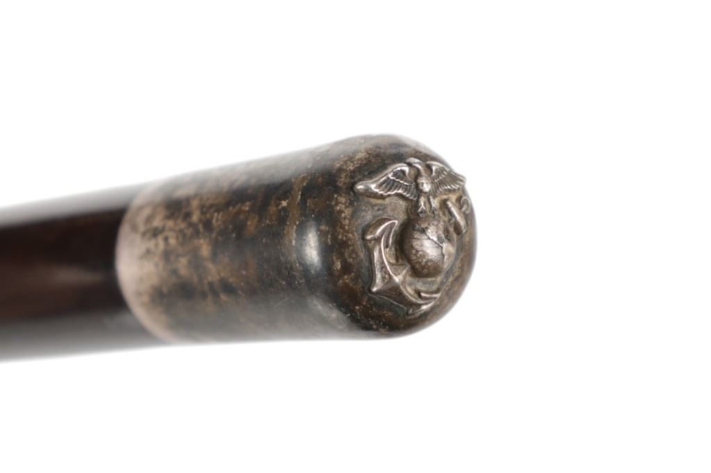 Featured in this lot is this pair of WWII USMC officer sterling silver swagger sticks. The swagger sticks feature a wonderfully and professionally crafted finished hardwood and sterling silver construction that is marked 'sterling' on the tips and the heads of the swagger sticks with an Eagle, Globe, and Anchor emblem featured on the heads. During World War II, swagger sticks were used in the United States Marine Corps primarily as a symbol of authority and discipline among noncommissioned officers and some officers. Though not officially required by regulation, the stick, typically a short, polished baton, was carried under the arm or in hand during inspections, parades, or garrison duties. It conveyed command presence and professionalism, reinforcing military bearing and respect among the ranks. While its practical use was limited, the swagger stick became a traditional emblem of pride and leadership within the Corps during the war years. The condition of this pair of USMC swagger sticks well preserved with some slight wear marks to the finish of the shafts and patina to the sterling silver adornments but otherwise shows a well preserved condition. The measurements of each swagger stick is 22" in length and 21 1/4" in length. The collective weight of these swagger sticks is 4oz.