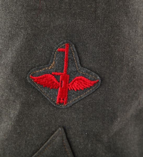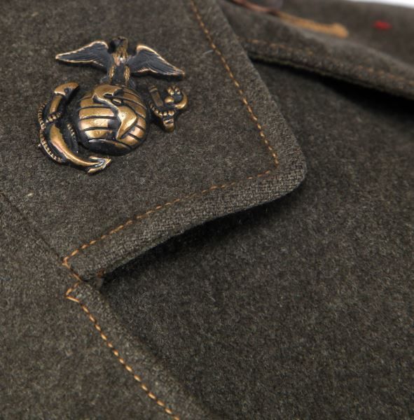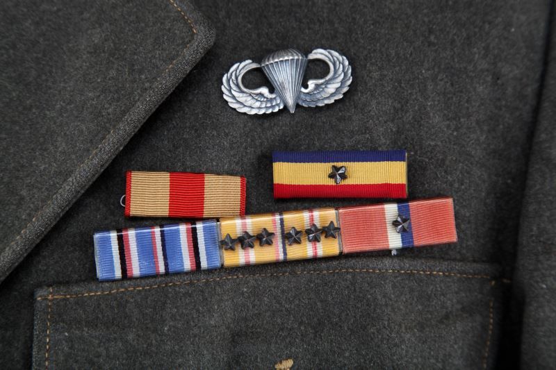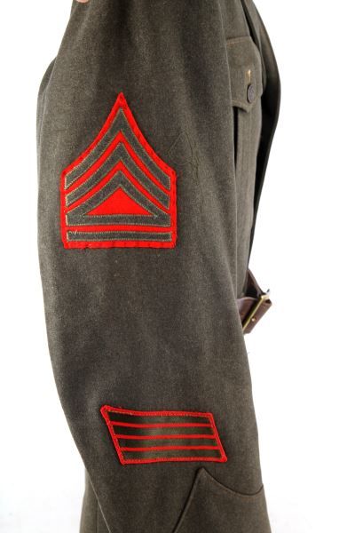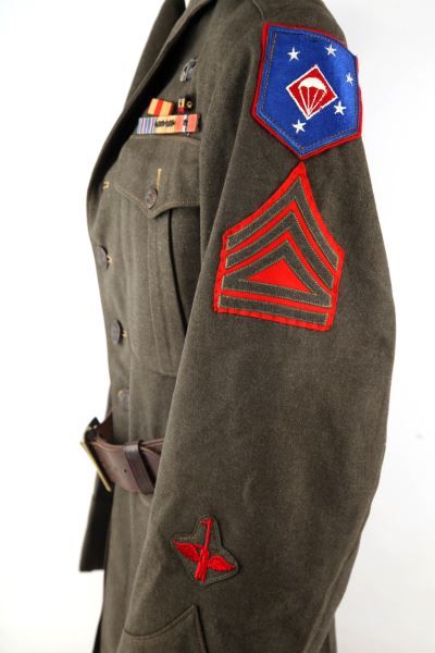 Named to Roy Blackwell, red felt border first assault shoulder patch, sterling jump wings, ribbons, garrison belt, small collar EGA and buttons, First Sargent cloth insignia, very good and free of mothing or damage.