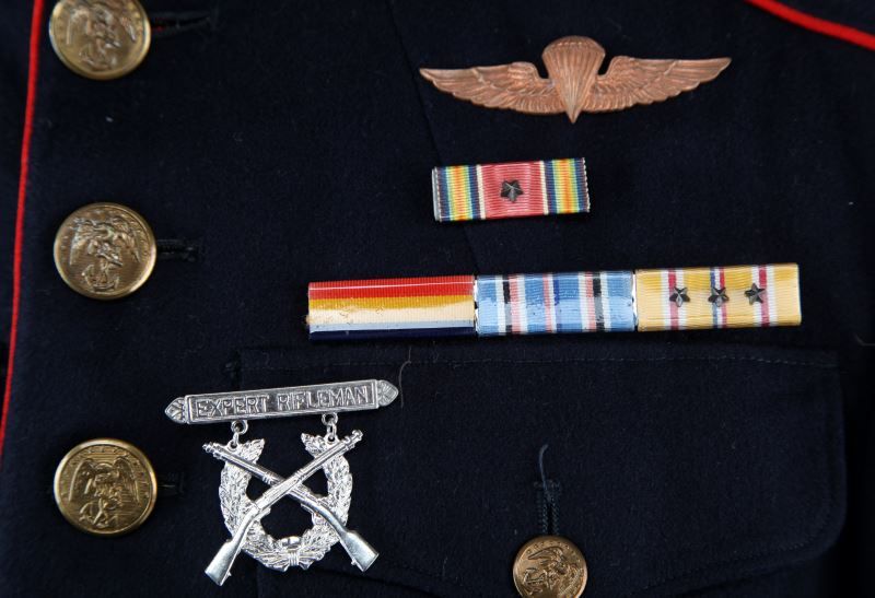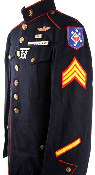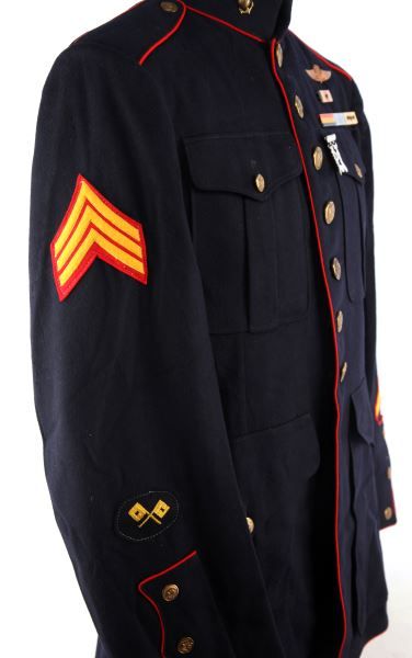 Red felt border shoulder patch, SGT. chevrons, service ribbons including Presidential Unit Citation, Para wings, collar EGA's, seven button tunic, signalman striker patch, with trousers, free of mothing and damage.