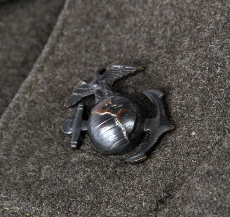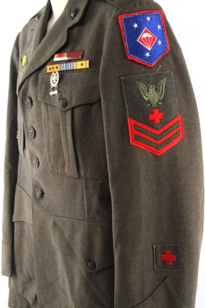 WWII USMC Paramarine medic's tunic. Red bordered paramarine patch, medic patch, early rifle expert badge, 2 globes, 5 service ribbons with 3 stars on Pacific, and ruptured duck. Likely enhanced with period insignia.