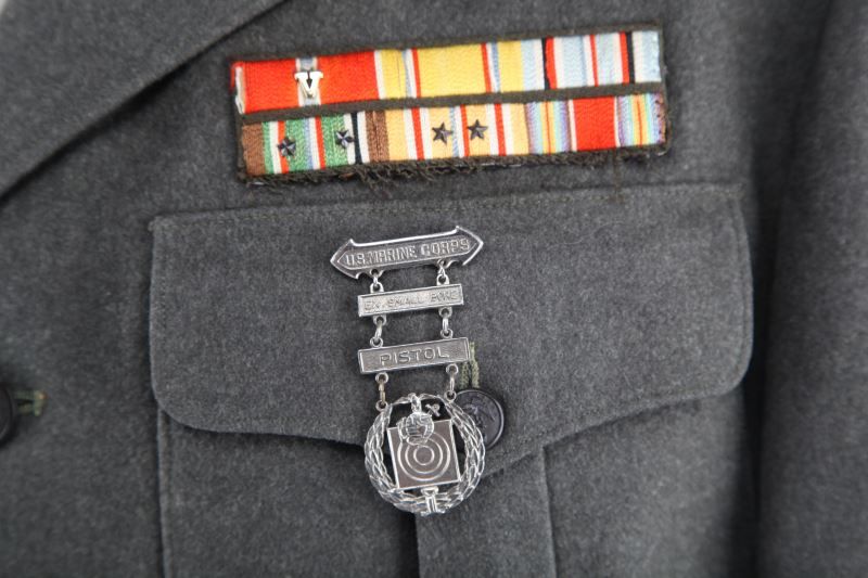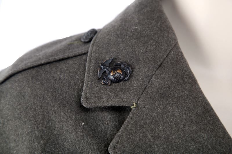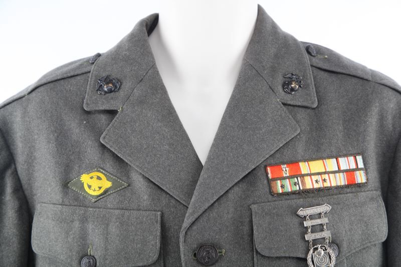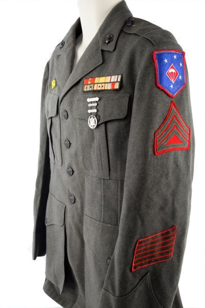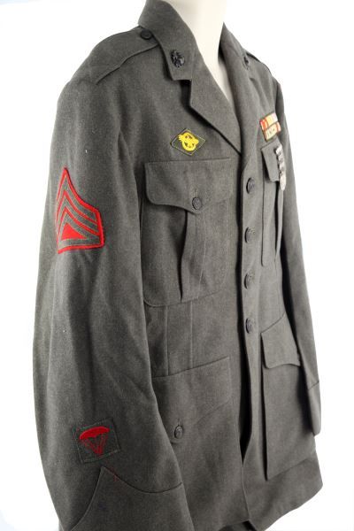 Straight rocker Staff SGT. named in sleeve A.E. Goeke, First Assault patch border, sewn ribbons including Bronze Star with Valor device, four button front, 24 year service stripes, about a size 40, moth damage free.