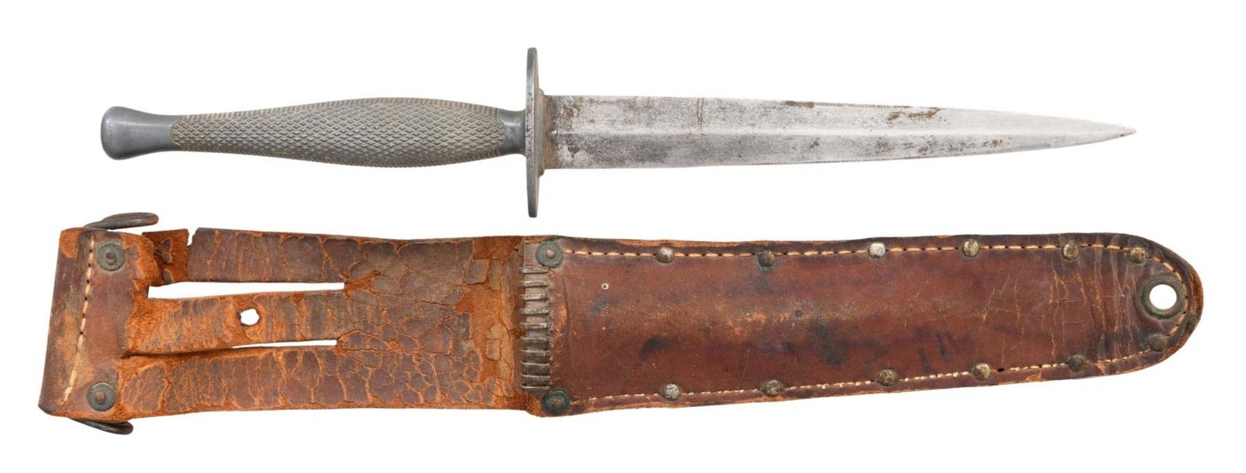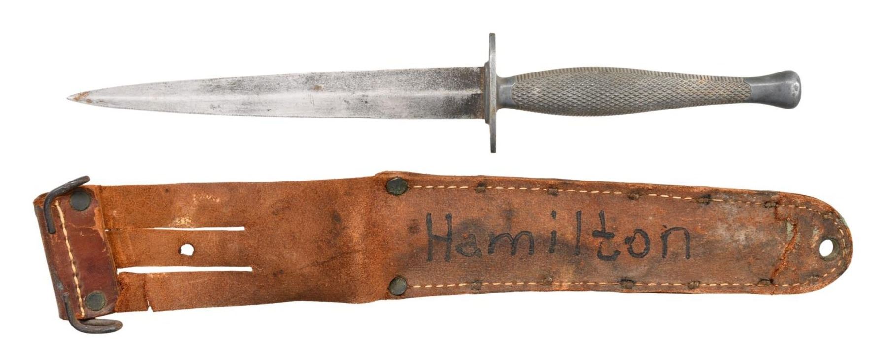 Overall length: 12”. Blade length: 6 3/4". Plain blade with a raised medial ridge. One-piece gray metal hilt with an elliptical guard featuring a smaller elliptical area where it meets the blade. The grip has crosshatching on both faces and lineal serrations on each side. The pommel is smooth and swells at the tip. The leather sheath measures approx. 14 1/2" overall with a grommet at the base and 7 rivets up each side. There are 10 steel teeth at the top of the sheath to prevent wear. A steel loop at the top facilitates wearing a web belt. The back of the sheath has the name “Hamilton” written in black ink over about 4 1/2". CONDITION: blade has a light gray patina with evidence of sharpening on the edges. Hilt shows light wear overall with a gray finish. Sheath shows moderate to heavy wear with a separation near the beltloop. (02-22439/BF). $800-1,200.