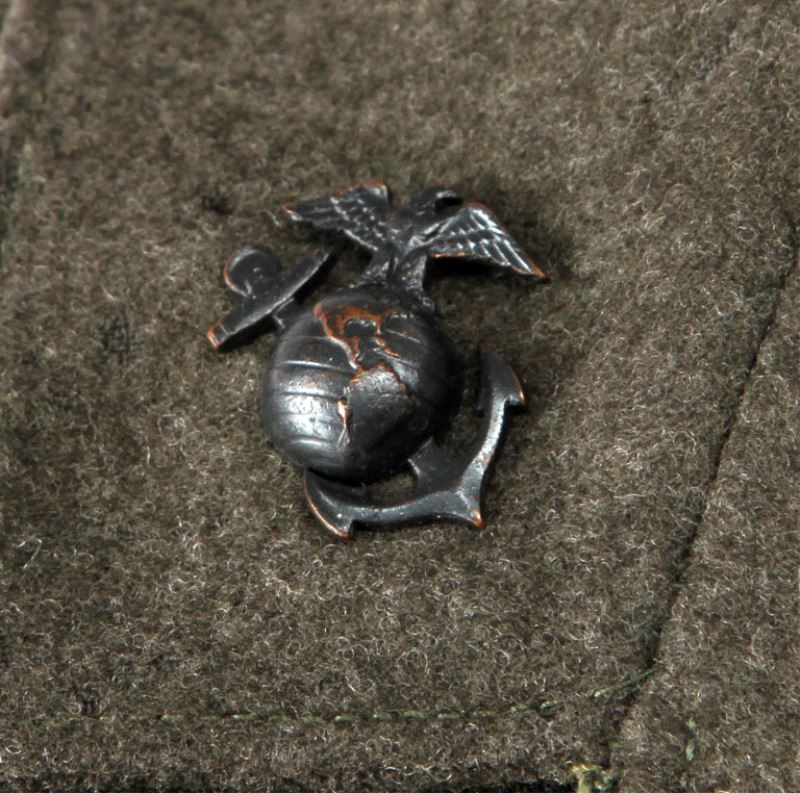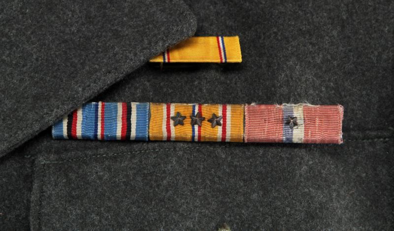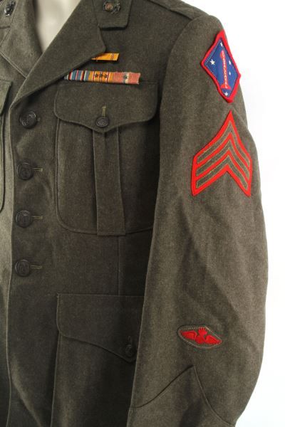 WWII Australian-made USMC tunic with 1st Division patch with blood border, sgt stripes, EGA's, 4 service ribbons with 3 stars on Pacific, and one star on Philippines. Service ribbons loose on one side, otherwise very good condition. Likely enhanced with period insignia.