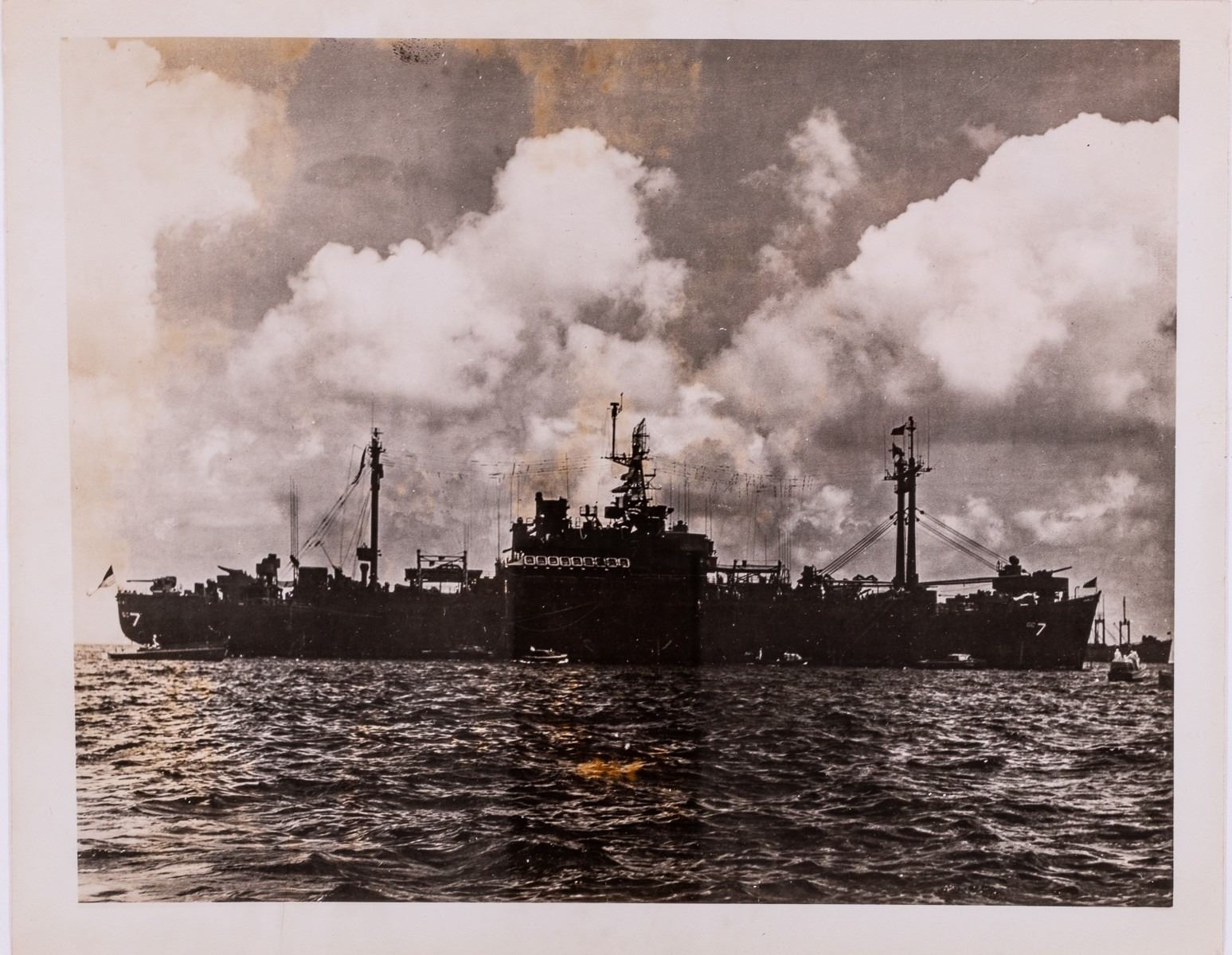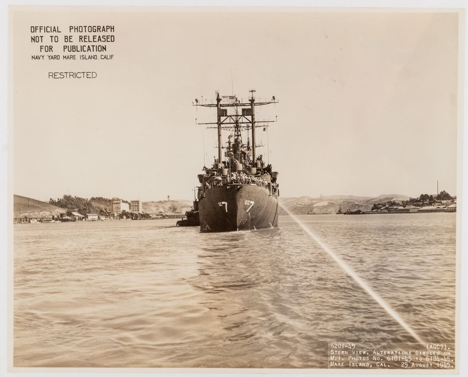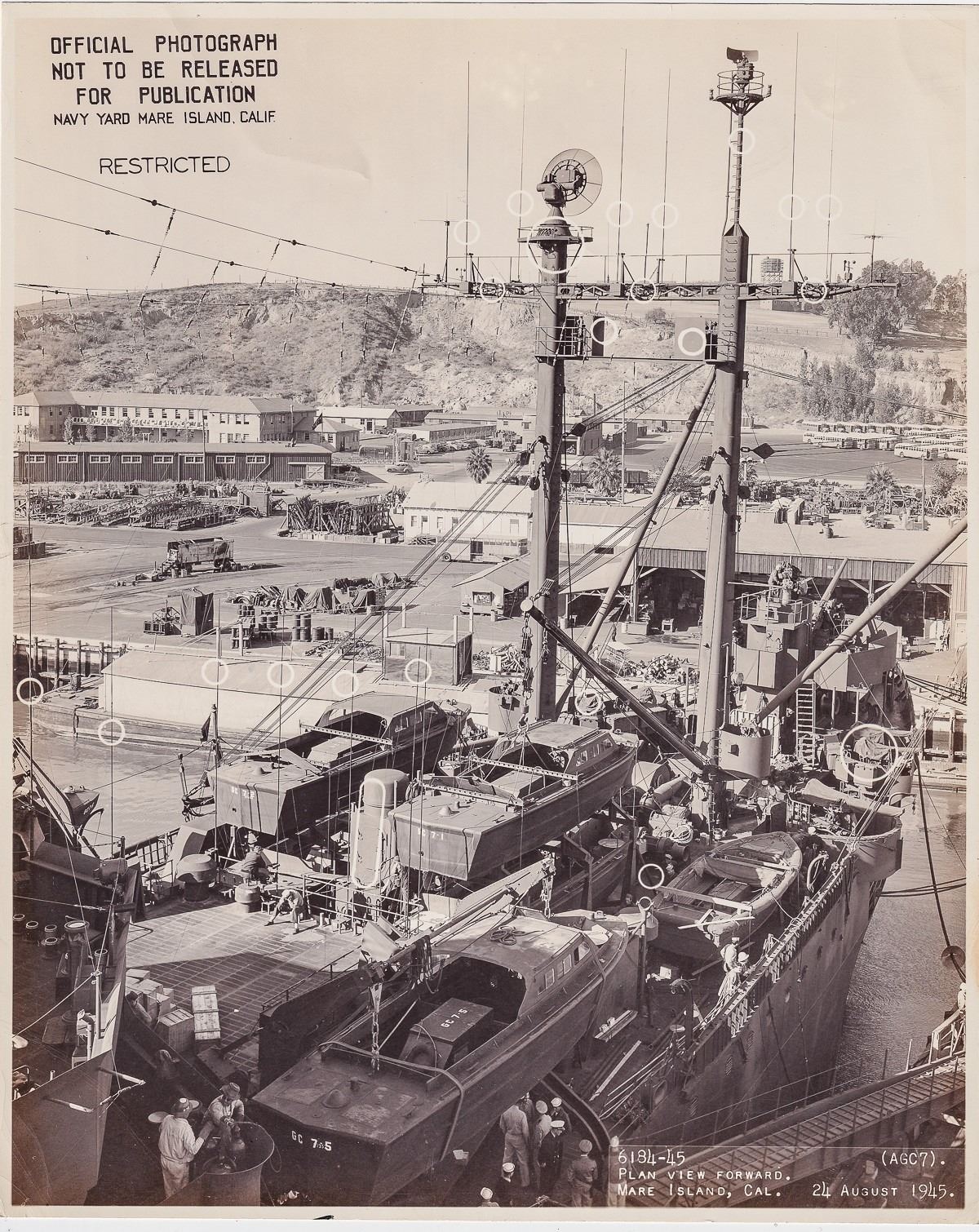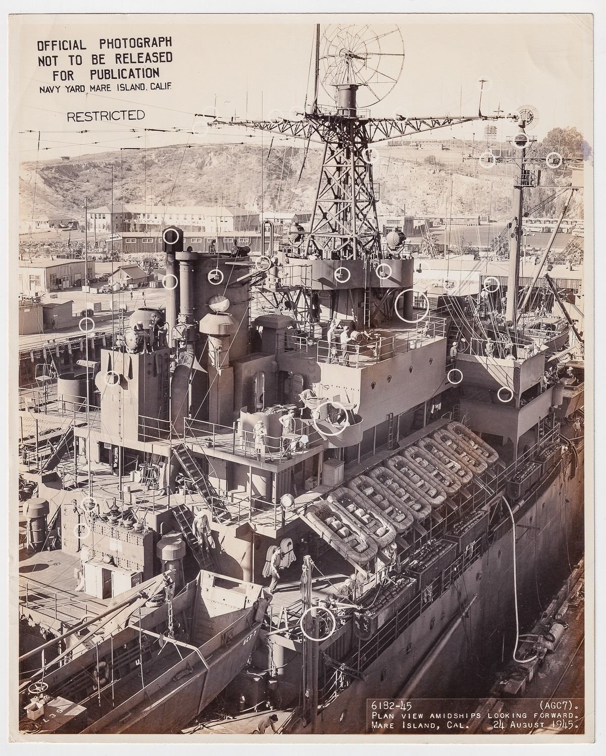 Photographs of the USS Mount McKinley AGC-7. The restricted photographs of the Naval ship were taken at the Navy Yard at Mare Island, California on August 24th and 25th, 1945. Some photos have white circles on them which are indicative of alterations. 'Official photograph not to be released for publication'. The USS Mount McKinley participated in Manila Bay and Okinawa attacks. She was also present for the atomic bomb tests at Bikini Atoll in 1946, the Korean War, and the Vietnam War. The ship was retired in 1970 and sold with four other ships in August 1977 for over $565,000. 8 x 10 inches.