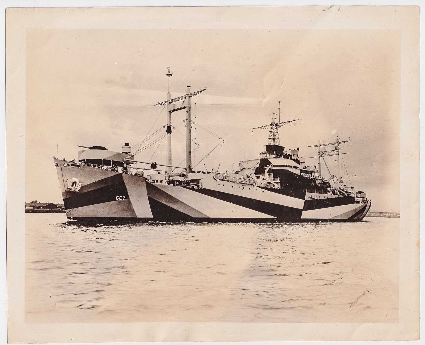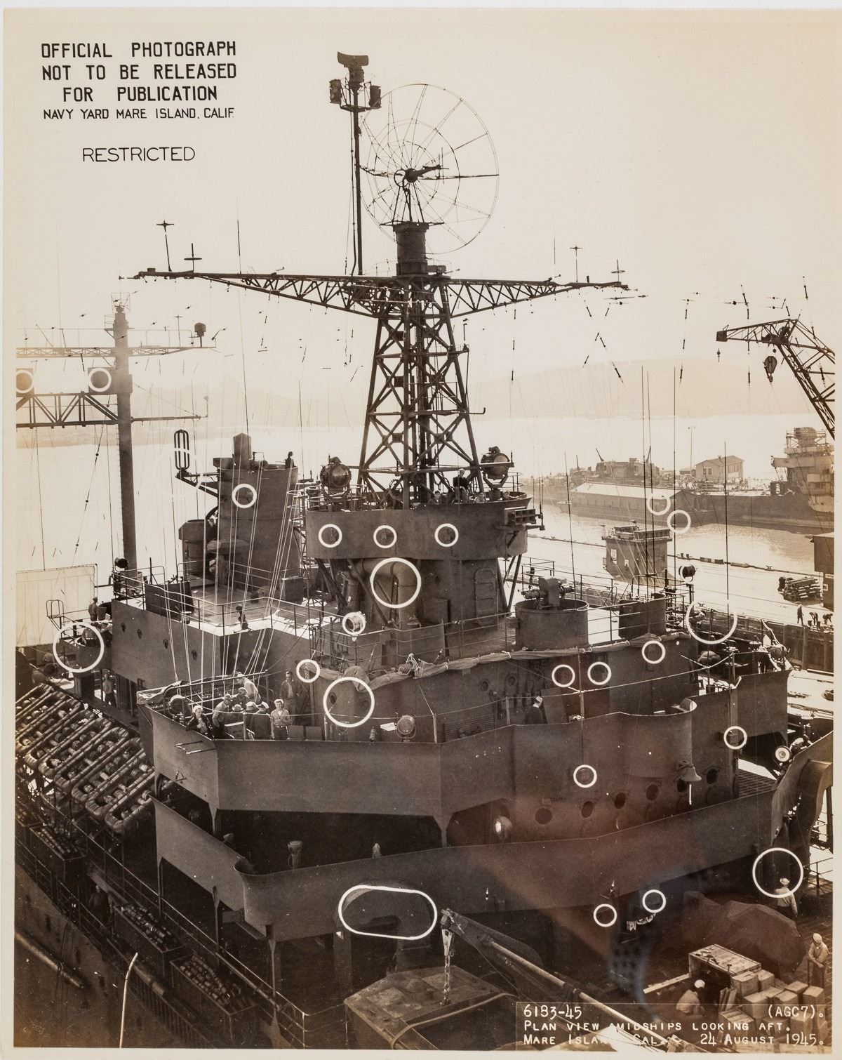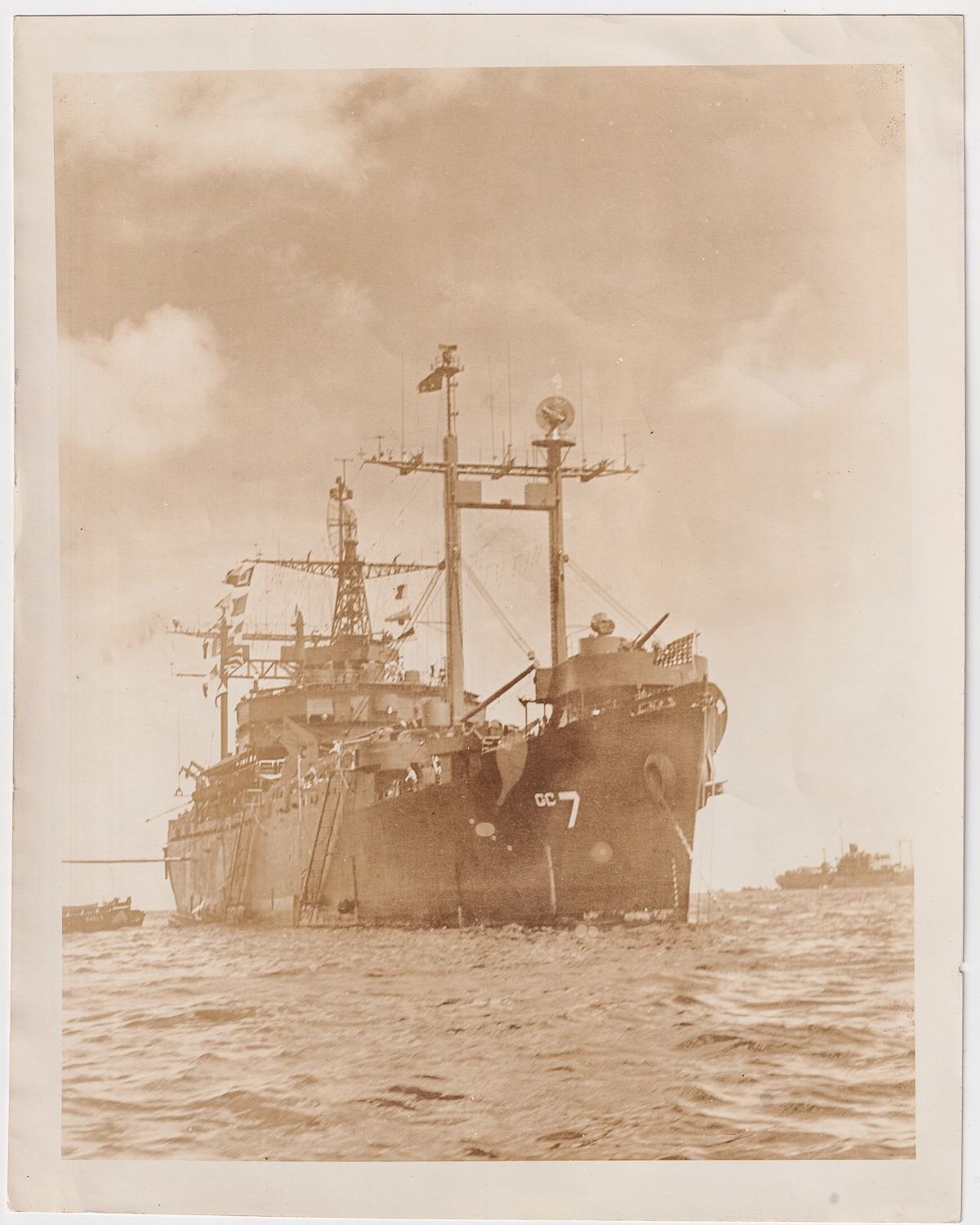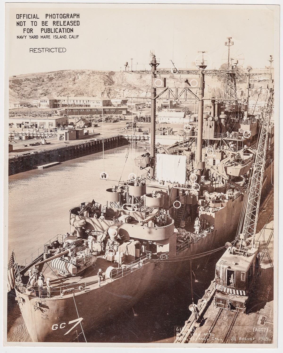 Photographs of the USS Mount McKinley AGC-7. The restricted photographs of the Naval ship were taken at the Navy Yard at Mare Island, California on August 24th and 25th, 1945. Some photos have white circles on them which are indicative of alterations. 'Official photograph not to be released for publication'. The USS Mount McKinley participated in Manila Bay and Okinawa attacks. She was also present for the atomic bomb tests at Bikini Atoll in 1946, the Korean War, and the Vietnam War. The ship was retired in 1970 and sold with four other ships in August 1977 for over $565,000. 8 x 10 inches.