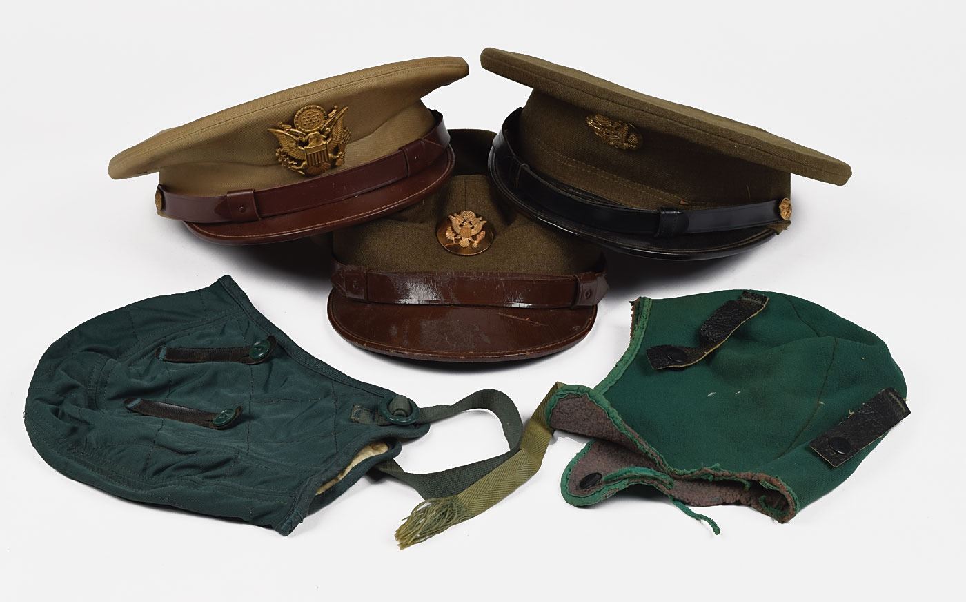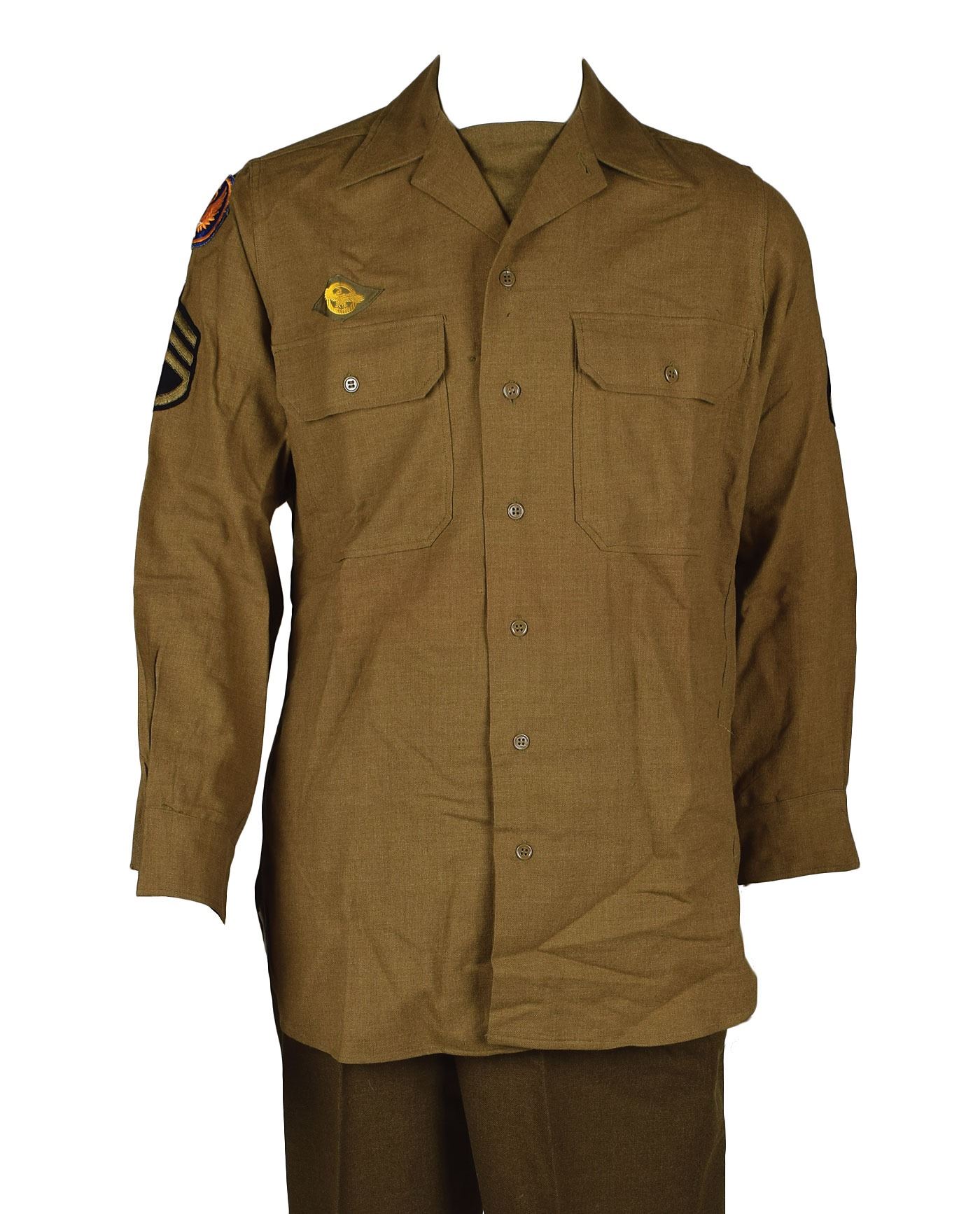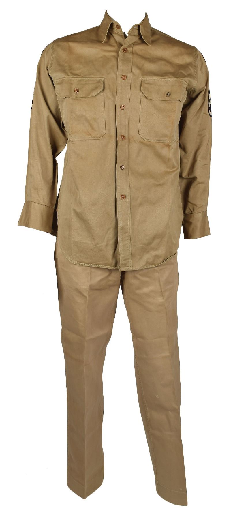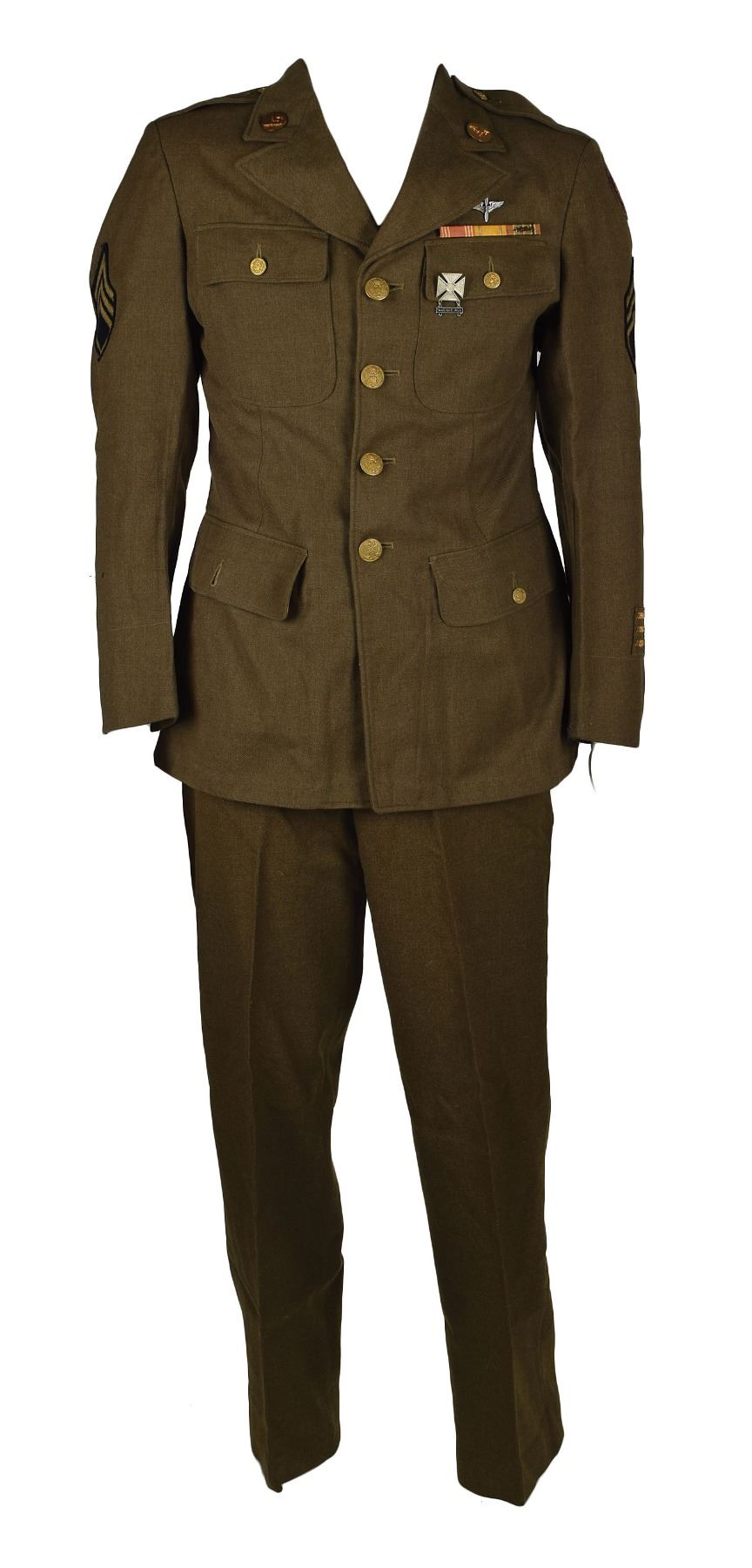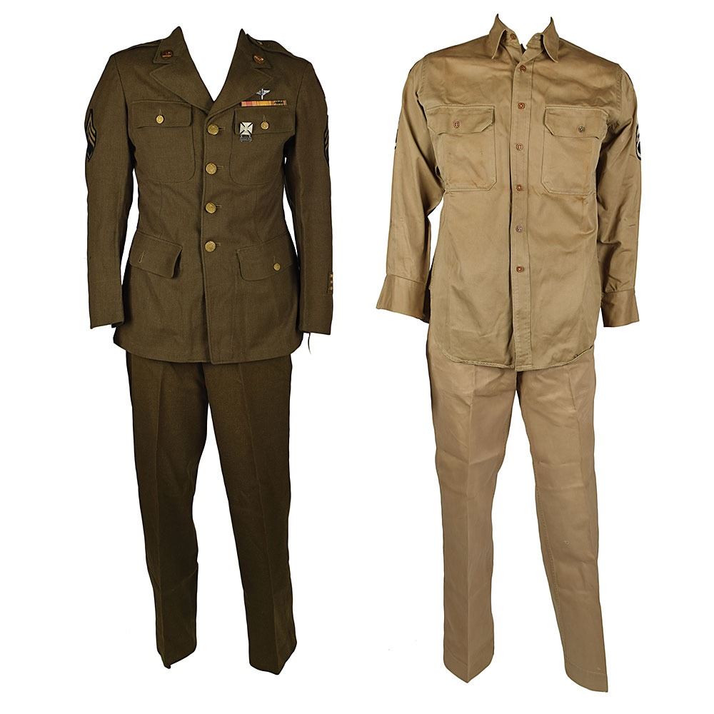 Multiple uniforms of B-24 bomber pilot Staff Sgt. Lowell D. Pyle, comprising two jackets, three shirts, three pairs of pants, two ties, three officer's hats, two pilot's flight caps, and two cloth belts, with an official Air Force garment bag (marked "Pyle, L. D., Capt....APO 710 Evil"). Includes: an olive drab Class 'A' sergeant's jacket, size 38R, with 15th Air Force shoulder patch, ribbon bar with four service stars, sterling silver wings and propellor pin, machine gun pin, and overseas service cuff insignia; a khaki shirt with Army Air Forces shoulder patch; a khaki jacket with 5th Air Force and 4th Air Force shoulder patches, sterling silver wings, and ribbon bar with two service stars; a khaki shirt with a 15th Air Force shoulder patch; an olive drab shirt with a 15th Air Force shoulder patch; two pairs of khaki pants; and one pair of olive drab pants.
