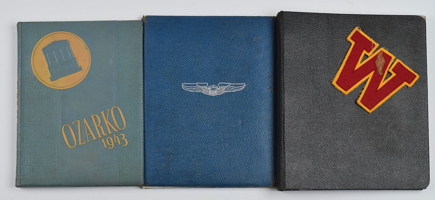 Includes a leather briefcase containing ephemera from Pyle's service, including: several Japanese Government Peso notes issued in the Philippines during WWII; Pyle's enlisted reserve corps card; a Quartermaster Corps card; a Civil Air Patrol D-4 rotating flight computer; a hardcover "Passing Light" 1944 yearbook from Lemoore Army Air Field; a few airfield maps and publications; and some other ephemera. In overall very good to fine condition.