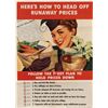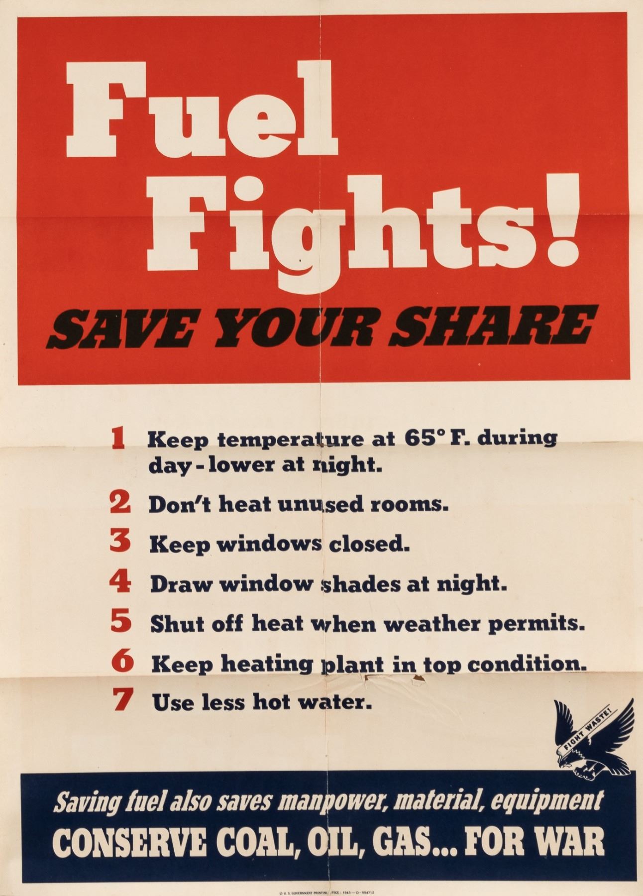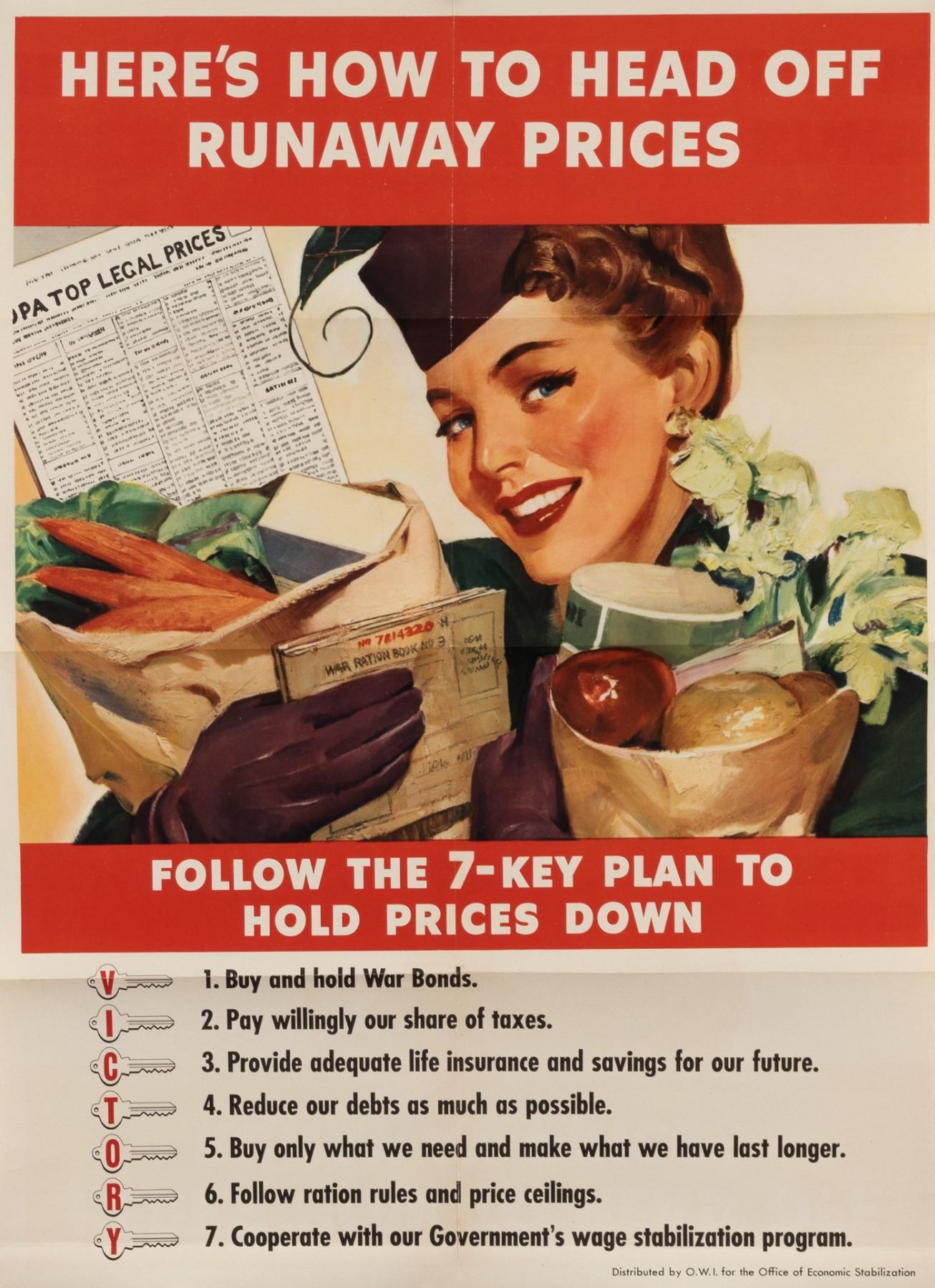 Two posters of the '7-Key Plan' made for Americans during the war to combat inflation. 1. 'Here's How to Head Off Runaway Prices', O.W.I. for the Office of Economic Stabilization, 1944, 20 x 28 inches. Minor splits and mailing folds. 2. 'Fuel Fights - Save Your Share - Conserve Coal, Oil, Gas...For War', U.S. Government Printing Office 1943-O-554712, 20 x 28 inches. Split along center with minor archival tape repair, minor loss, and mailing folds.
