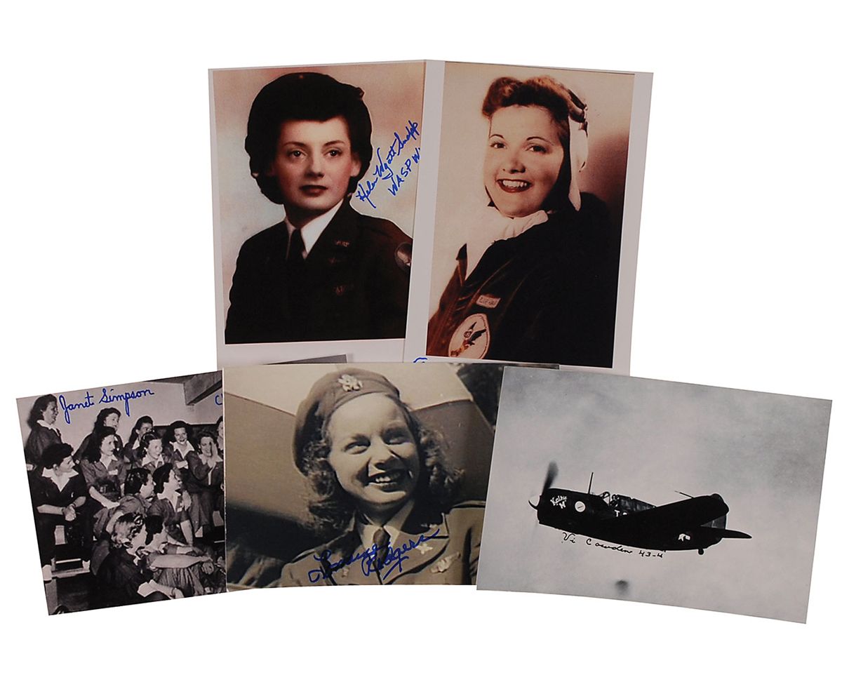 Five glossy photos, 4 x 6 and 6 x 4, each signed in felt tip by a female pilot. Signers are: Violet Cowden, Elaine Harmon, Janet Lee-Simpson, Helen Wyatt Snapp, and Lorraine Rodgers. In overall fine condition.