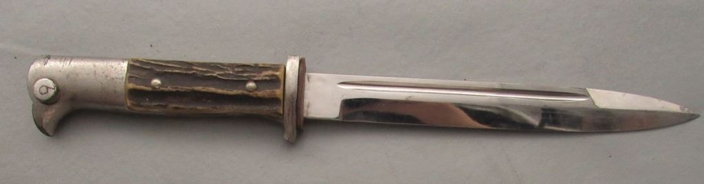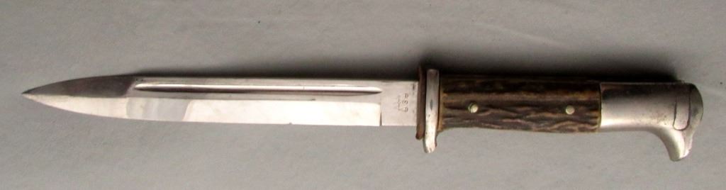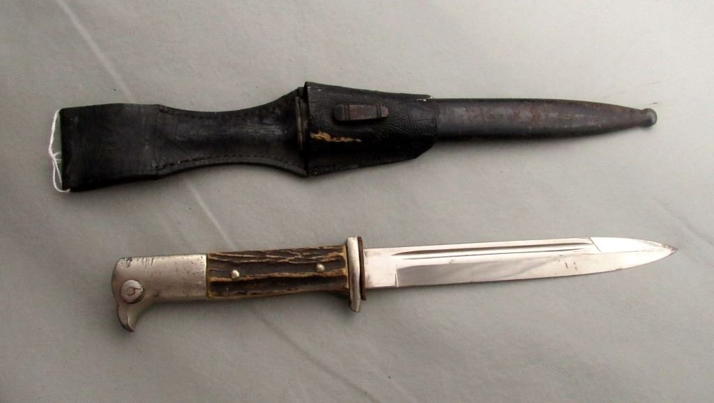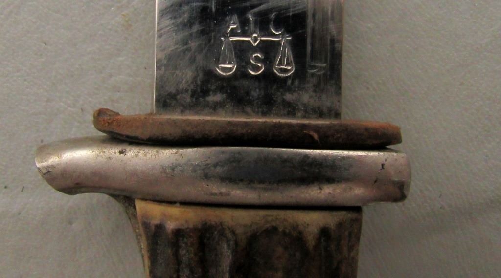 BAYONET WITH STAG HANDLES. MARKINGS ON THE BLADE ARE ACS AND HAS A BALANCE. HAS SCABBARD AND FROG. SOME SCRATCHES ON THE HANDLE. SOME CHIPS AND LIGHT SURFACE RUST ON THE SCABBARD.