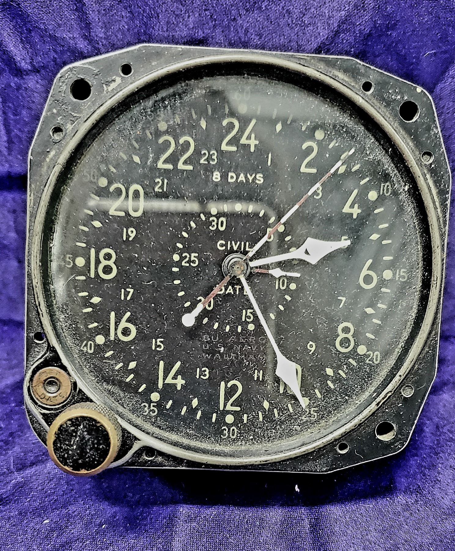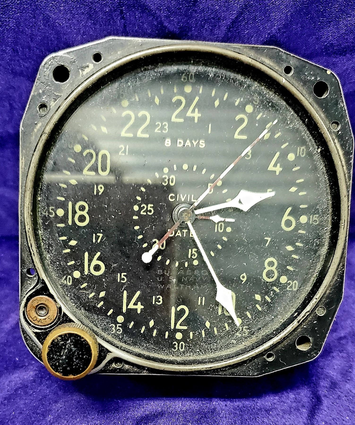 An 8 Day WWII Waltham Aircraft Clock with a Civil Date dial. This clock was the replacement for the Jaegar A-10 which was ordered before the US entered WWII.