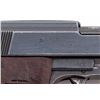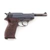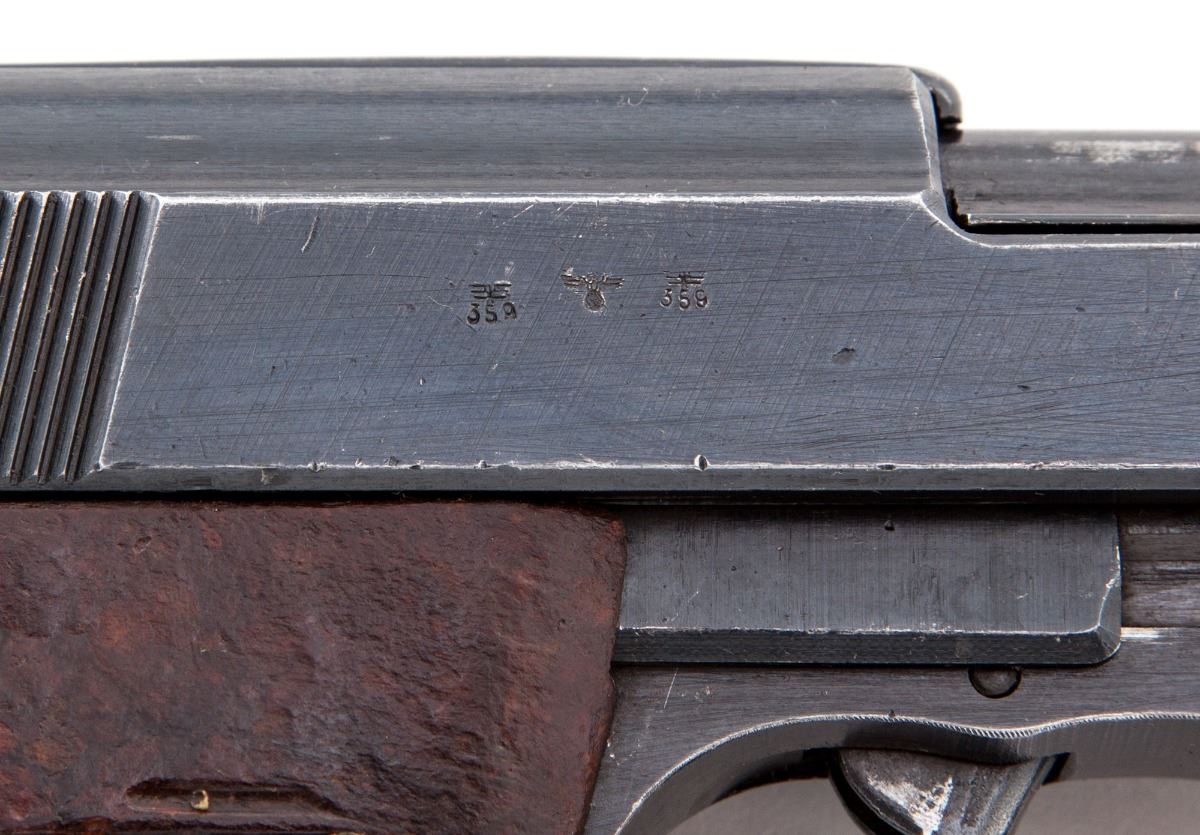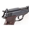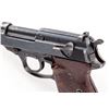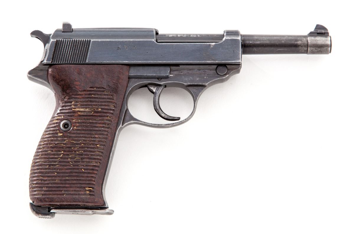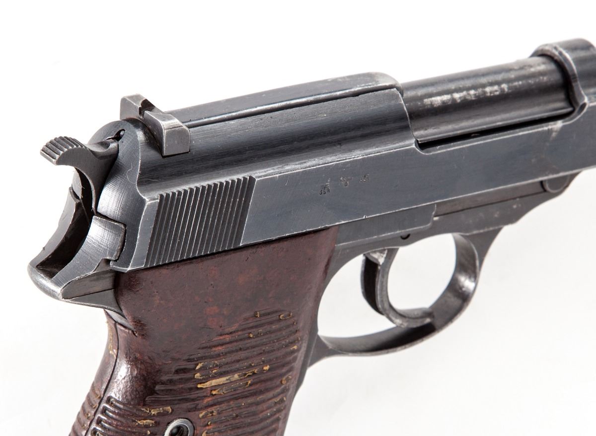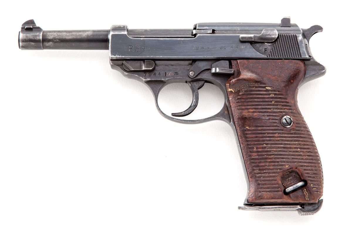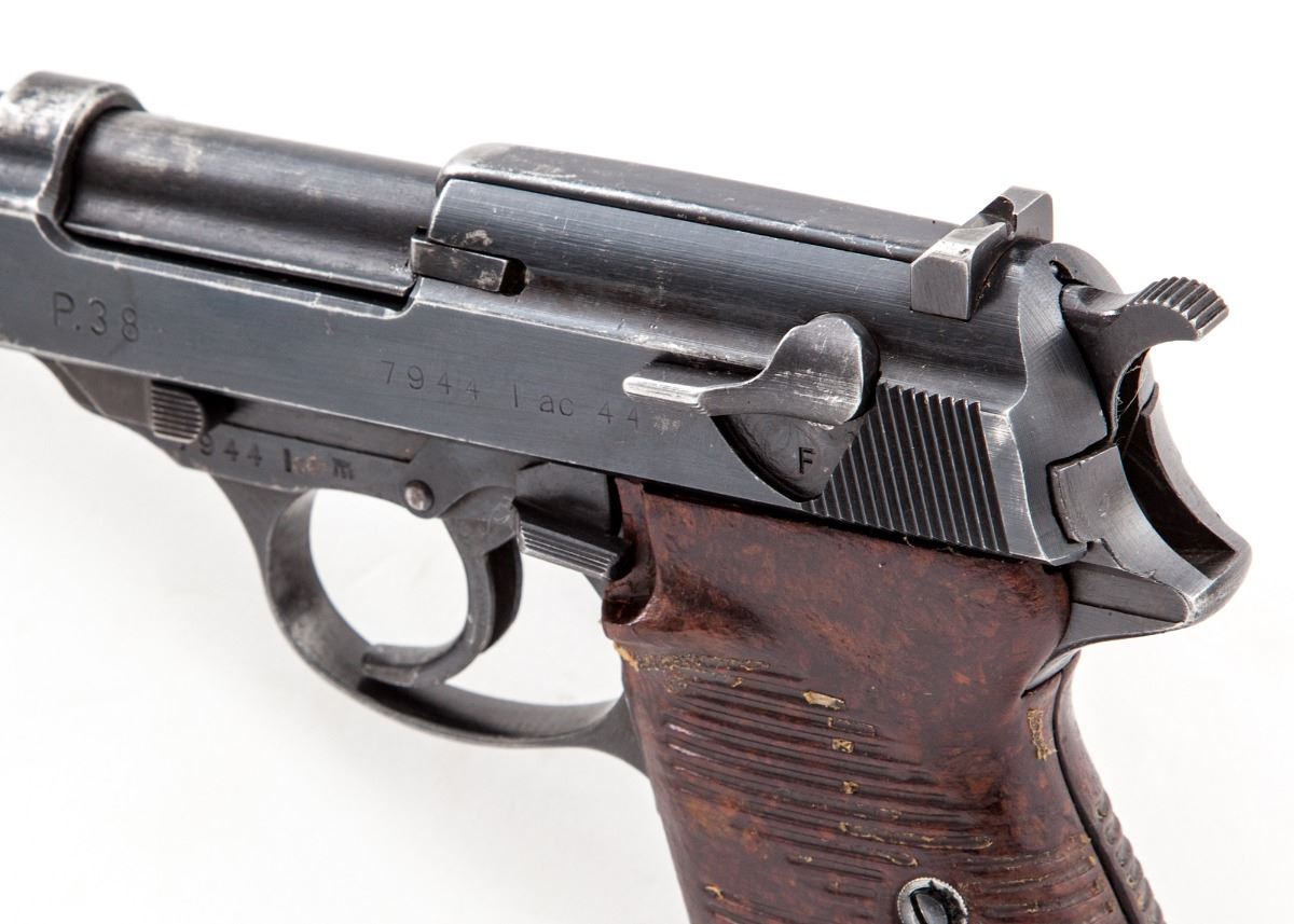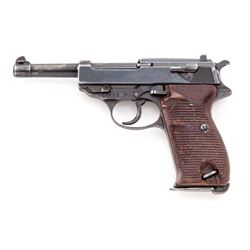 WWII Walther P-38 Semi-Automatic Pistol, #7944l, (ac-44), 9mm, 4-7/8'' barrel, blue finish, grooved brown phenolic resin grips, with one WWII era P-38 marked magazine. Condition is very good with all visible matching serial numbers including locking block, retaining approx. 85% thinning blue with most of the losses to barrel assembly and high edges. Grips have been improperly cleaned and have lost most of their top finish. Action and bore are fine. Est.: $600-$800. (C&R/PPT)