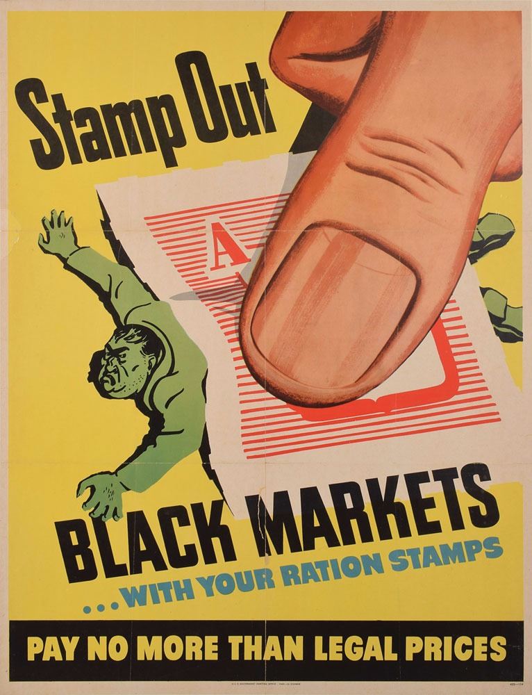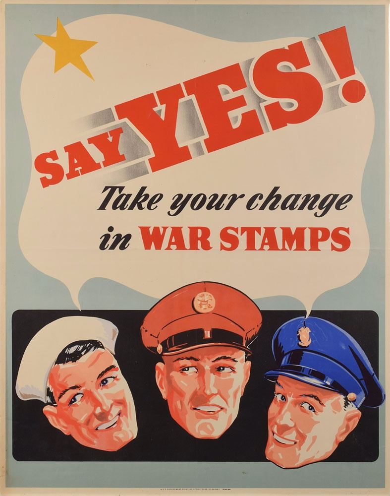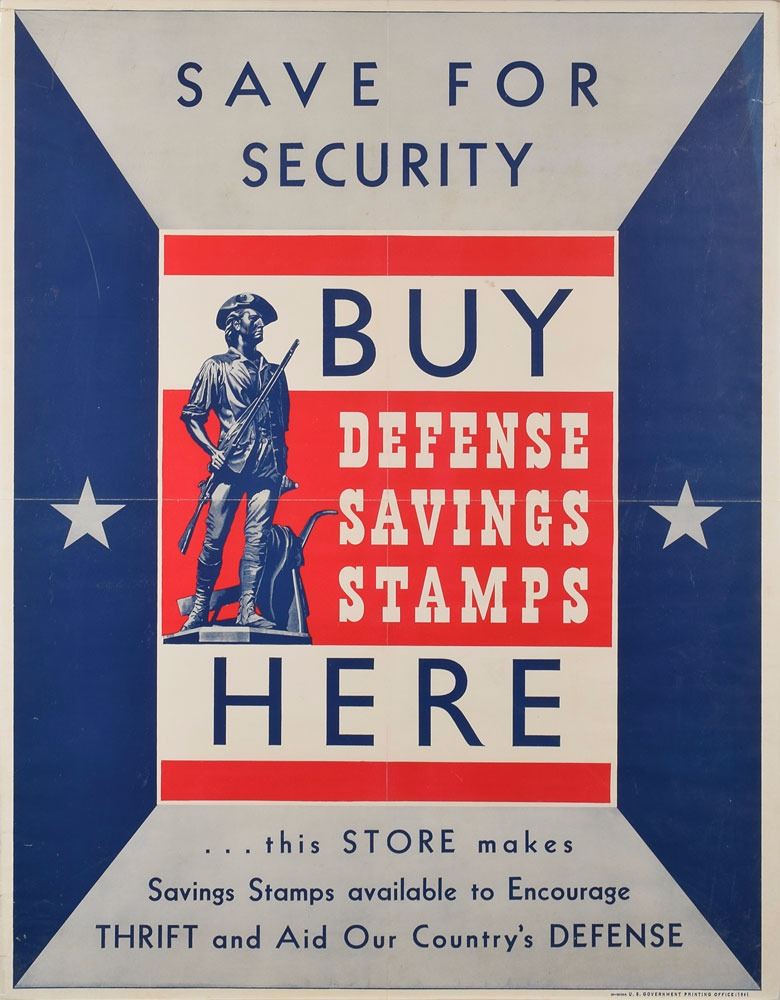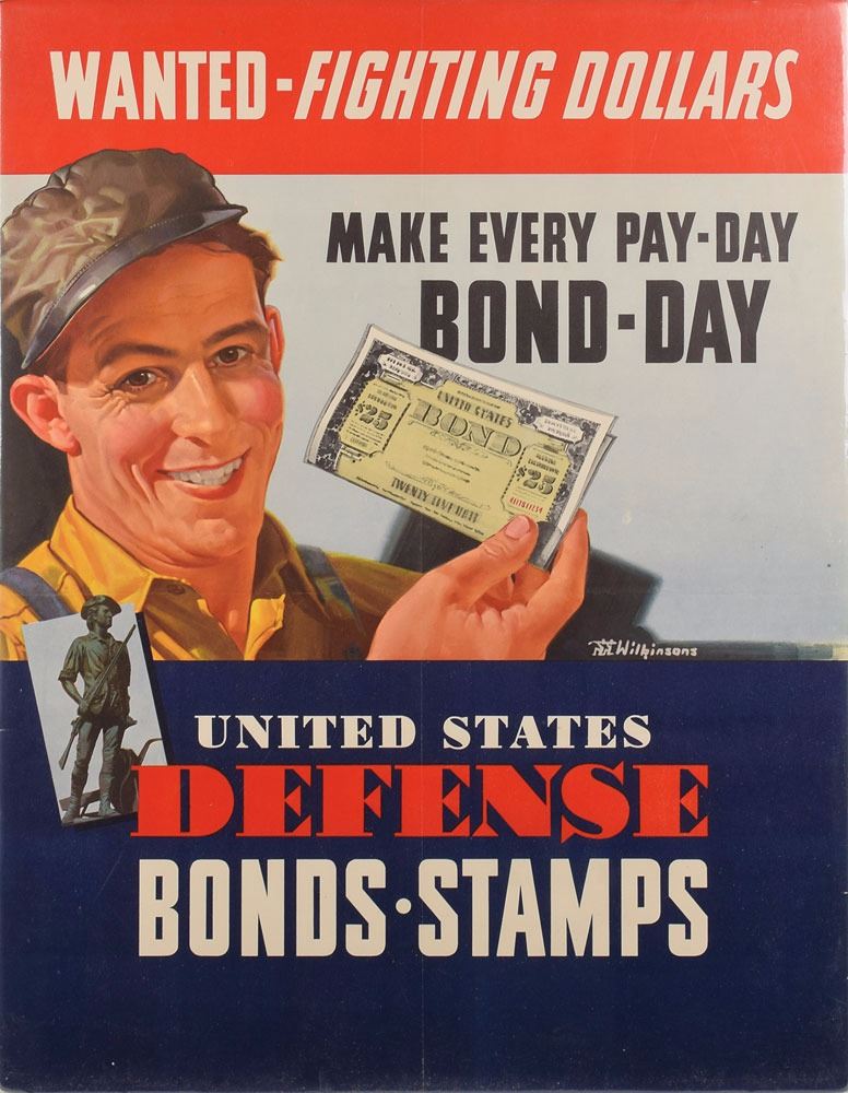Collection of four original color American WWII posters for wartime fundraising efforts, including: a 20 x 26 poster showing a worker holding up a war bond, with text, "Wanted—Fighting Dollars, Make Every Pay-Day Bond-Day"; a 22 x 28 poster published by the US Government Printing Office in 1941, reading, "Save for Security, Buy Defense Savings Stamps Here"; a 20.75 x 27 poster published by the US Government Printing Office in 1943, reading, "Stamp Out Black Markets…with Your Ration Stamps"; and a 22 x 28 poster published by the US Government Printing Office in 1942, reading, "Say Yes! Take your change in War Stamps." In overall very good to fine condition, with a few scattered tears.