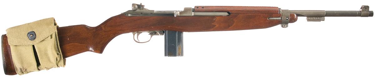 WWII Winchester carbine with late features, rebuilt with mixed parts and some late Inland parts. Top barrel marked "bomb/W.R.A./11-42" with circled "P" proof ahead of pistol grip. Complete with detachable magazine, green canvas sling and "USMC/BOYT" marked two-magazine pouch.