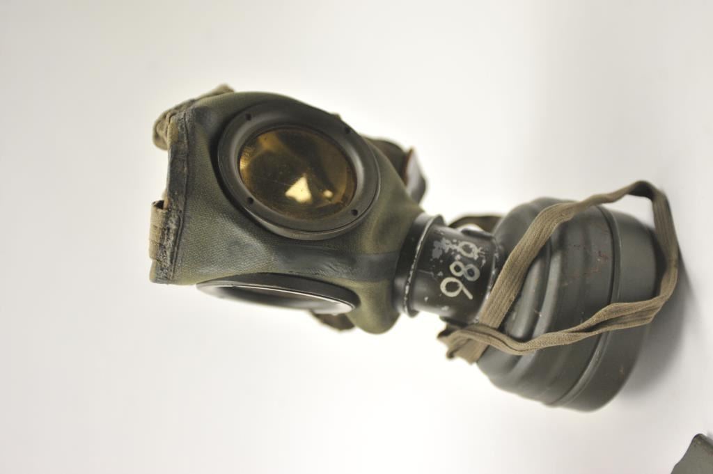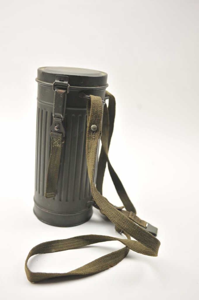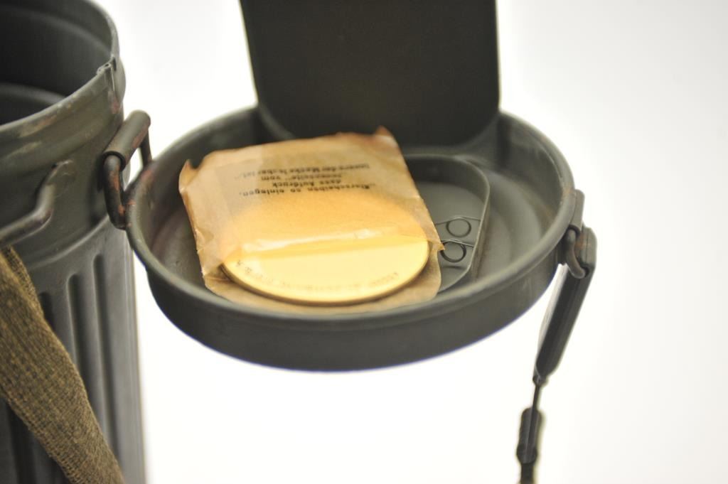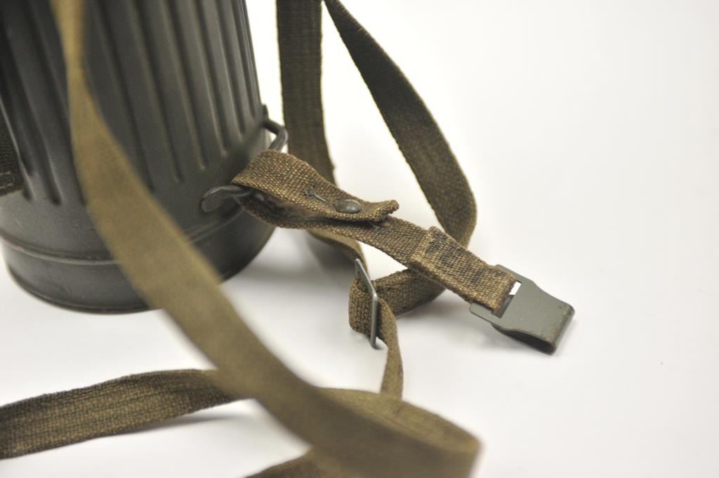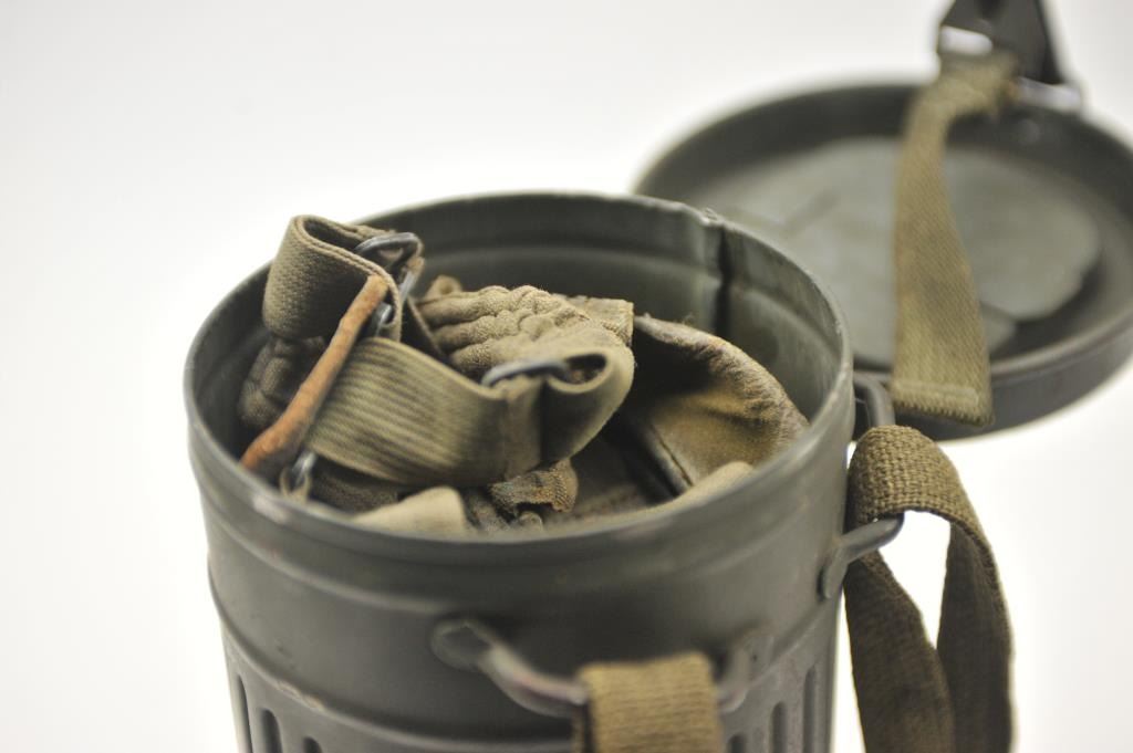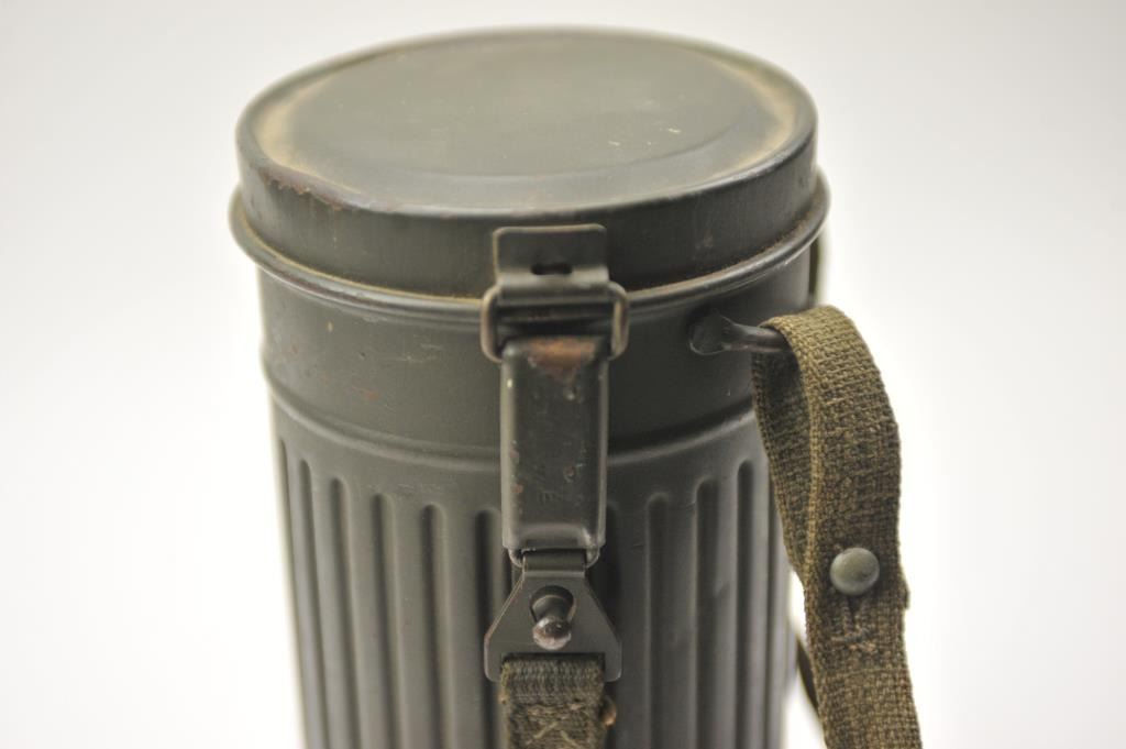 WWII era German gas mask in canister. The OD green canister and mask are in good overall condition with period canvas straps. Est.: $200-$400.