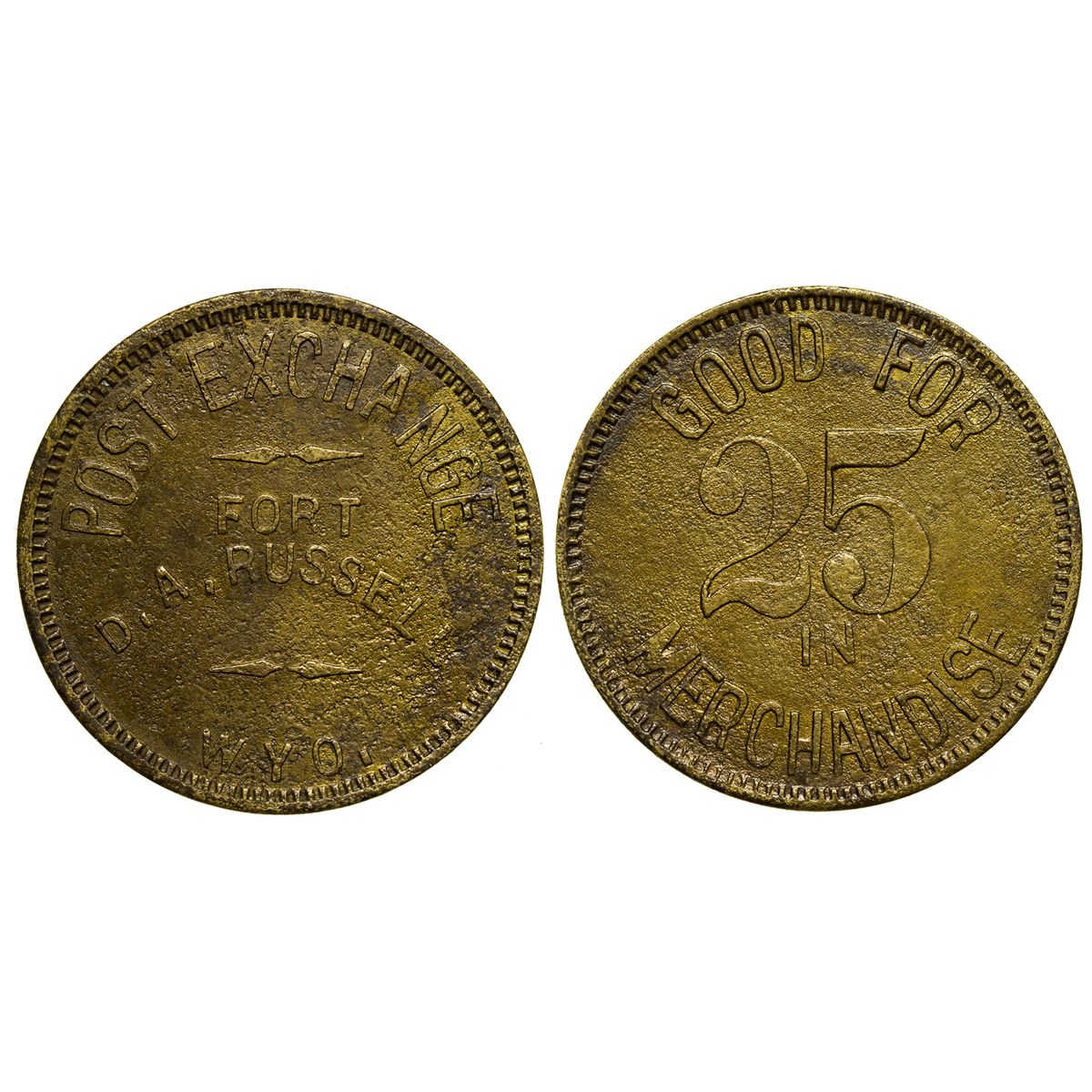 This piece is good for 25 cents in merchandise at the Post Exchange at Fort D.A. Russell. It is in good condition. This post on Crow Creek was located at the intersection of the Union Pacific Railroad and Crow Creek in 1867.