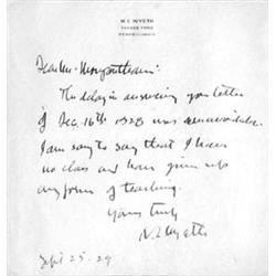 (1882 -1945) Renowned American illustrator and artist who created some of the most recognizable images of his time, the father of painter Andrew Wyeth. Uncommon A.L.S. on his printed letterhead, 1p. 8vo., [Chadds Ford, PA], Sept. 25, 1929, to Mr. Morganthau, in part: ""...The delay in answering your letter...was unavoidable. I am sorry to say that I have no class and have given up any forms of teaching..."". Boldly penned, handsome matted in lavender burgundy accents with a portrait and set into a gilt frame.