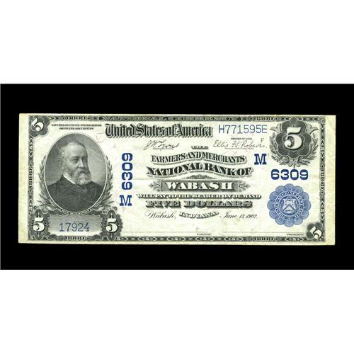 <B>Wabash, IN</B></I> - $5 1902 Plain Back Fr. 624 <B>The Farmers & Merchants NB</B></I> Ch. # (M)6309<BR>Bold, white paper on this <B>Very Fine</B></I> note lacks only the Signatures to be an ideal mid-grade note from this bank.