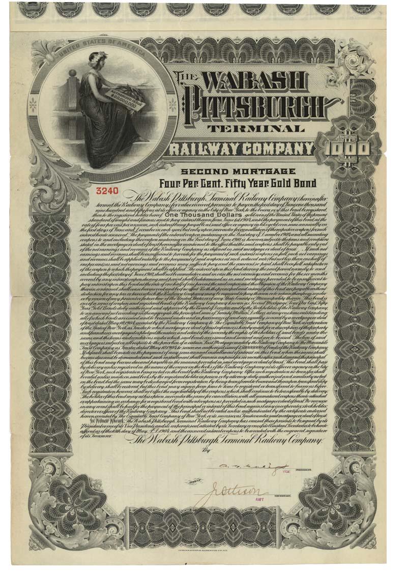 1904, New York. $1000 Second Mortgage 4% fifty year gold bond. Black/ White/. Engraved vignette of a allegorical female at upper left.. Uncancelled and very fine. Coupons attached.