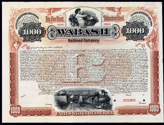 Michigan, Ohio, Indiana, Illinois, Missouri and Iowa, 18xx, $1000, Specimen Bond, Black on brown border and underprint, Reclined lady to center two moving locomotives under bridge bottom center, VF condition, ABNC.