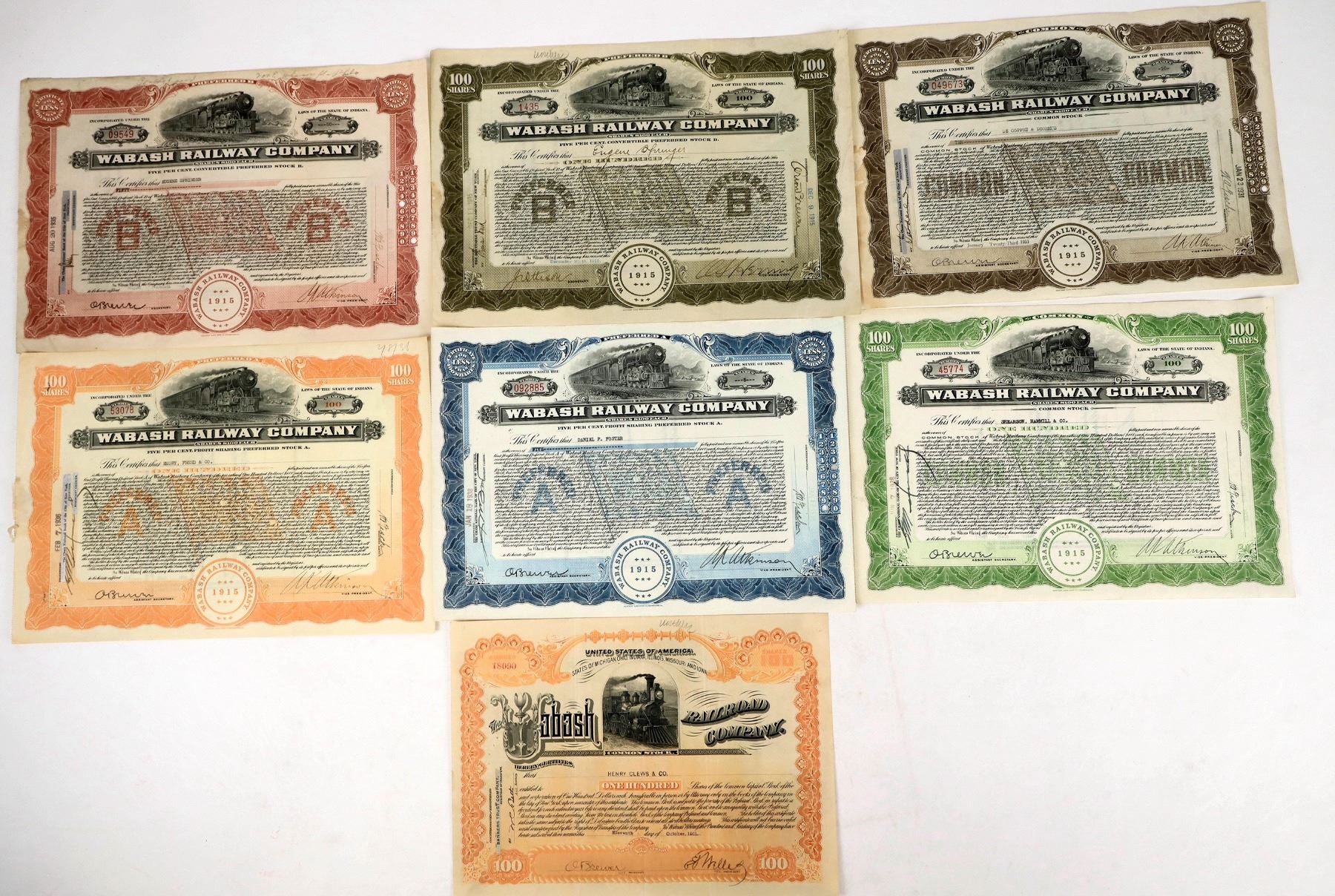 There are seven stocks for the Wabash Railway Co. of Indiana, but also Michigan, Ohio, Illinois, Missouri, and Iowa. 1911-1939. Please see photo for details.