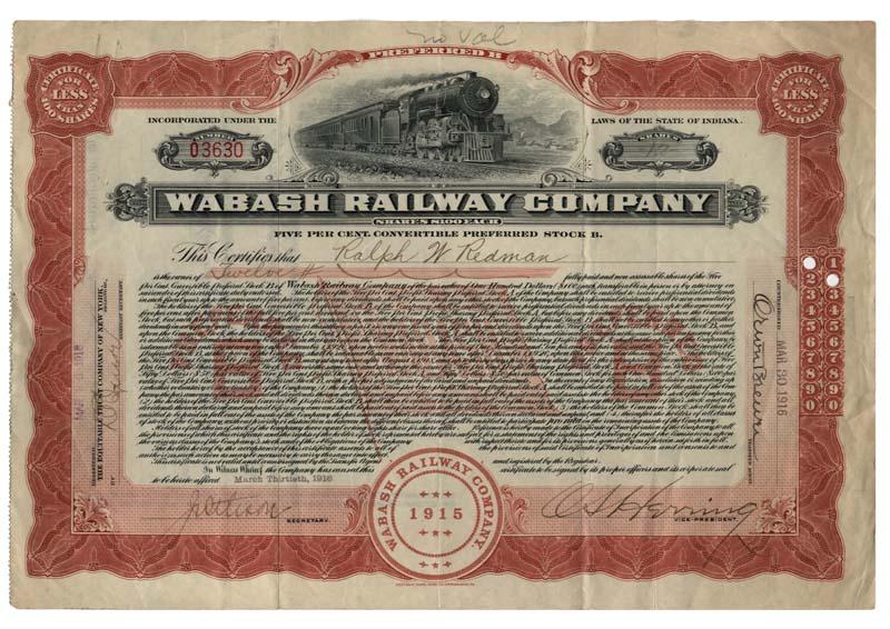 1916, Indiana. Stock certificate for 12 shares. Maroon/Black. Engraved vignette of a steam locomotive at center. Uncancelled and Fine.