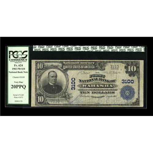 <B>Wabasha, MN</B></I> - $10 1902 Plain Back Fr. 624 <B>The First NB</B></I> Ch. # 3100<BR>This offering comes from a bank which is relatively available in the 1929 series, but is quite another story altogether in large, with only 11 survivors and but $3,860 still in circulation from here in 1935. The blue signatures are readily legible on this <B>PCGS Very Fine 20PPQ.</B></I> Expect bidding to reach at least in the range of...