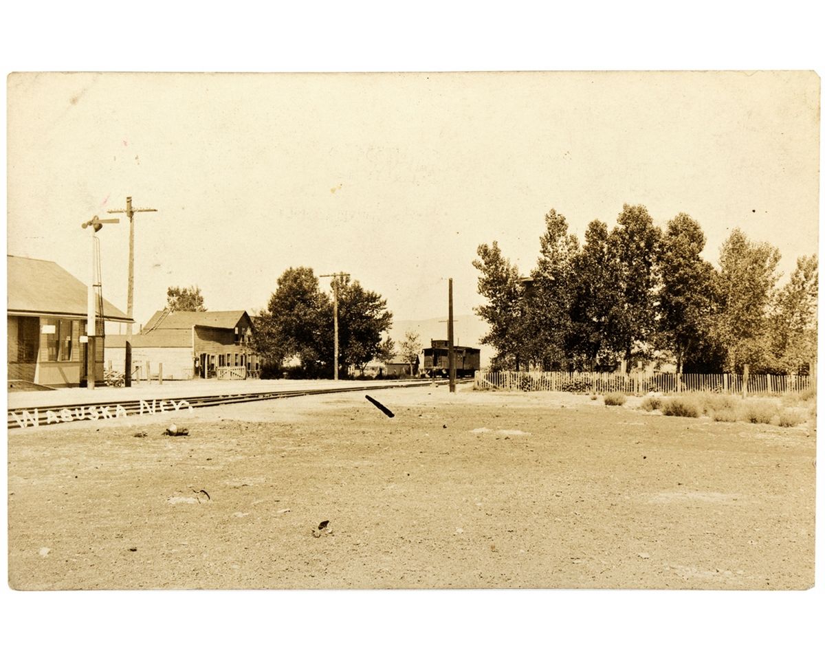 Wabuska was established in the early 1870s. In 1881, the town served as the principal Mason Valley supply center on the newly constructed Carson and Colorado Railroad. When copper was discovered in Mason Valley, the town became the northern terminus of the new Nevada Copper Belt Railroad, built 1909-1911. Wabuska waned with declining mining activity in the 1920s. This postcard shows a simple rail line and buildings. The reverse is inscribed "HERE IS A PHOTO OF/ WABUSKA". - Jacobitz Collection -60125