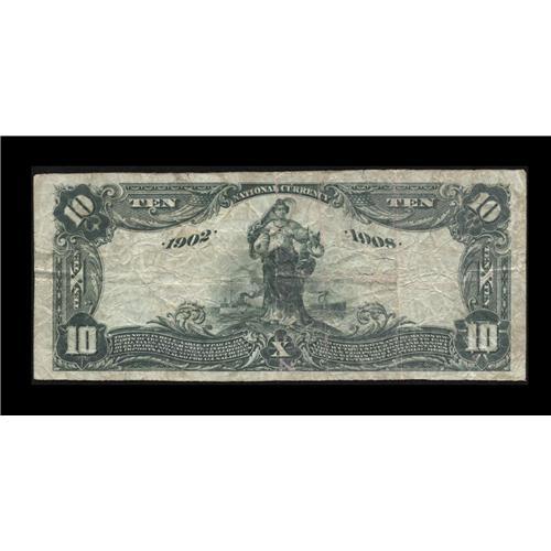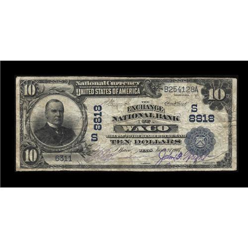 <B>Waco, TX</B></I> - $10 1902 Date Back Fr. 618 <B>The Exchange NB </B></I> Ch. # (S) 8818<BR>There are only 4 notes listed in the latest Kelly census for this McLennan county institution. Bright purple stamped signatures highlight this rarity, with a single spindle hole at the end of Vernon's signature to be noted. Expect some heated bidding amongst the Texas collectors. <B>Very Good-Fine.</B></I>