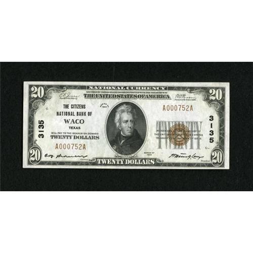 <B>Waco, TX</B></I> - $20 1929 Ty. 1 <B>The Citizens NB</B></I> Ch. # 3135<BR> A well embossed example with a couple soft folds that is as bright as the day it was printed. <B>Extremely Fine-About Uncirculated</B></I>.<BR><BR><b>Shipping:</b> Coins & Currency (<a target="_blank" href="http://www.heritageauctions.com/common/shipping.php">view shipping information</a>)