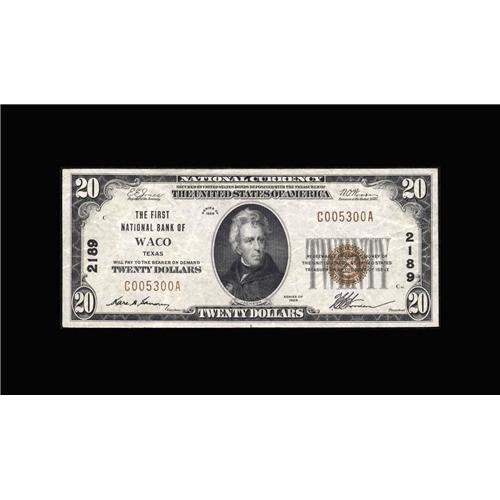 <B>Waco, TX</B></I> - $20 1929 Ty. 1 <B>The First NB</B></I> Ch. # 2189<BR>This $20 is perfectly centered and without defects. The title of this early Waco institution was changed from the Waco National Bank in February 1889. A popular, affordable item among collectors of Texas Nationals and Baylor grads. <B>Extremely Fine.</B></I>