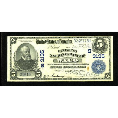 <B>Waco, TX</B></I> - $5 1902 Plain Back Fr. 598 <B>The Citizens NB</B></I> Ch. # (S)3135<BR> This example is closer to the higher of the split grade despite the small stain. <B>Very Fine-Extremely Fine</B></I>.<BR><BR><b>Shipping:</b> Coins & Currency (<a target="_blank" href="http://www.heritageauctions.com/common/shipping.php">view shipping information</a>)
